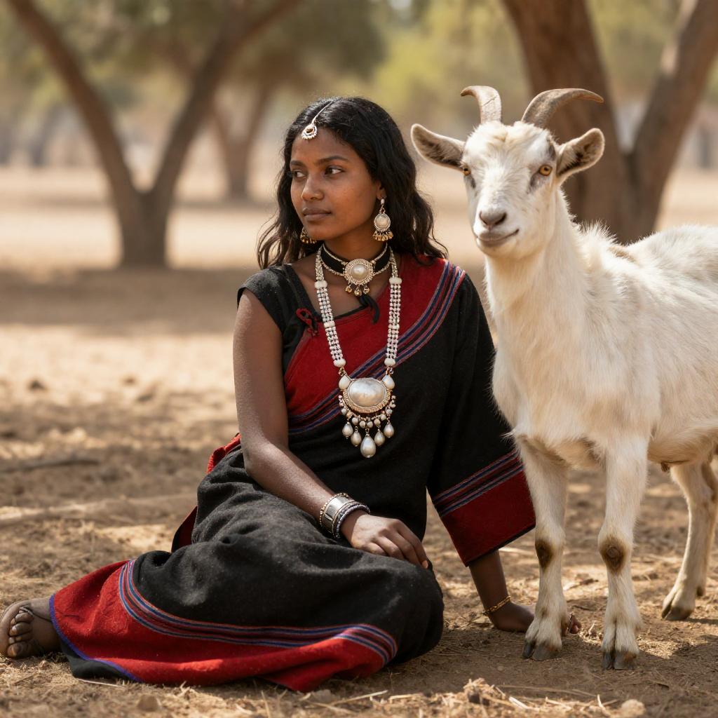 Photograph of a young woman with medium brown skin and dark hair, wearing a black and red traditional dress with intricate jewelry, sitting on the ground in a sunlit, dry, wooded area. A goat stands to her right, partially in shadow. She gazes slightly to the left, with a calm expression. Sunlight filters through the branches, casting a warm glow.