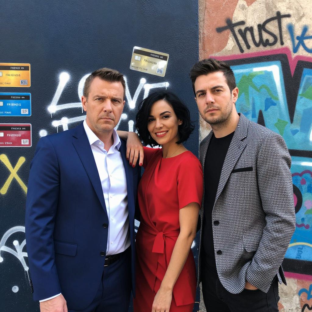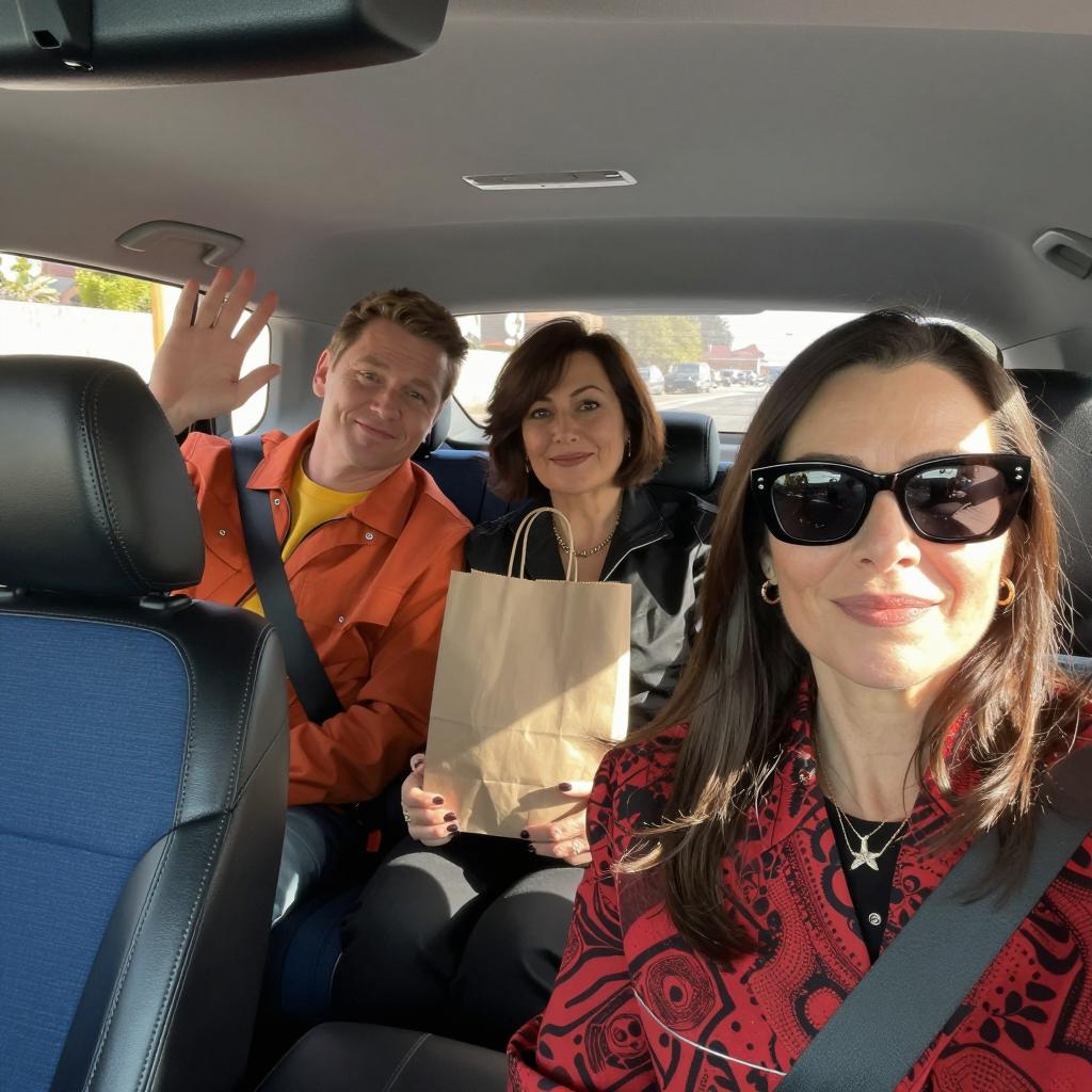 A group of three adults inside a car. A man with short brown hair dressed in an orange jacket and yellow shirt waves his right hand from the back seat. Next to him, a woman with short brown hair wearing a black jacket holds a brown paper bag. In the front passenger seat, a woman with long brown hair, wearing black sunglasses and a red patterned jacket, smiles towards the camera. Bright sunlight streams through the car windows highlighting the interior with blue and black leather seats.