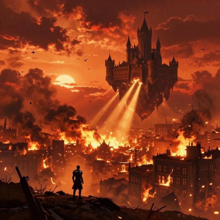 Photograph of a dramatic scene: a large, intense fire with bright orange and yellow flames consuming a circular area in a barren, rocky landscape. Dark, thick smoke billows upward, contrasting with a fiery red and orange sky. In the foreground, a silhouetted figure of a person with a short coat stands facing the fire, their silhouette dark and shadowed. The background features distant, dark mountains under the vividly colored sky. The image emphasizes the stark contrast between the fiery, bright center and the dark, quiet foreground.