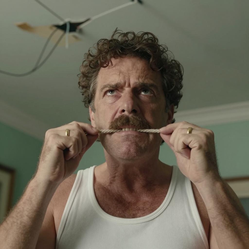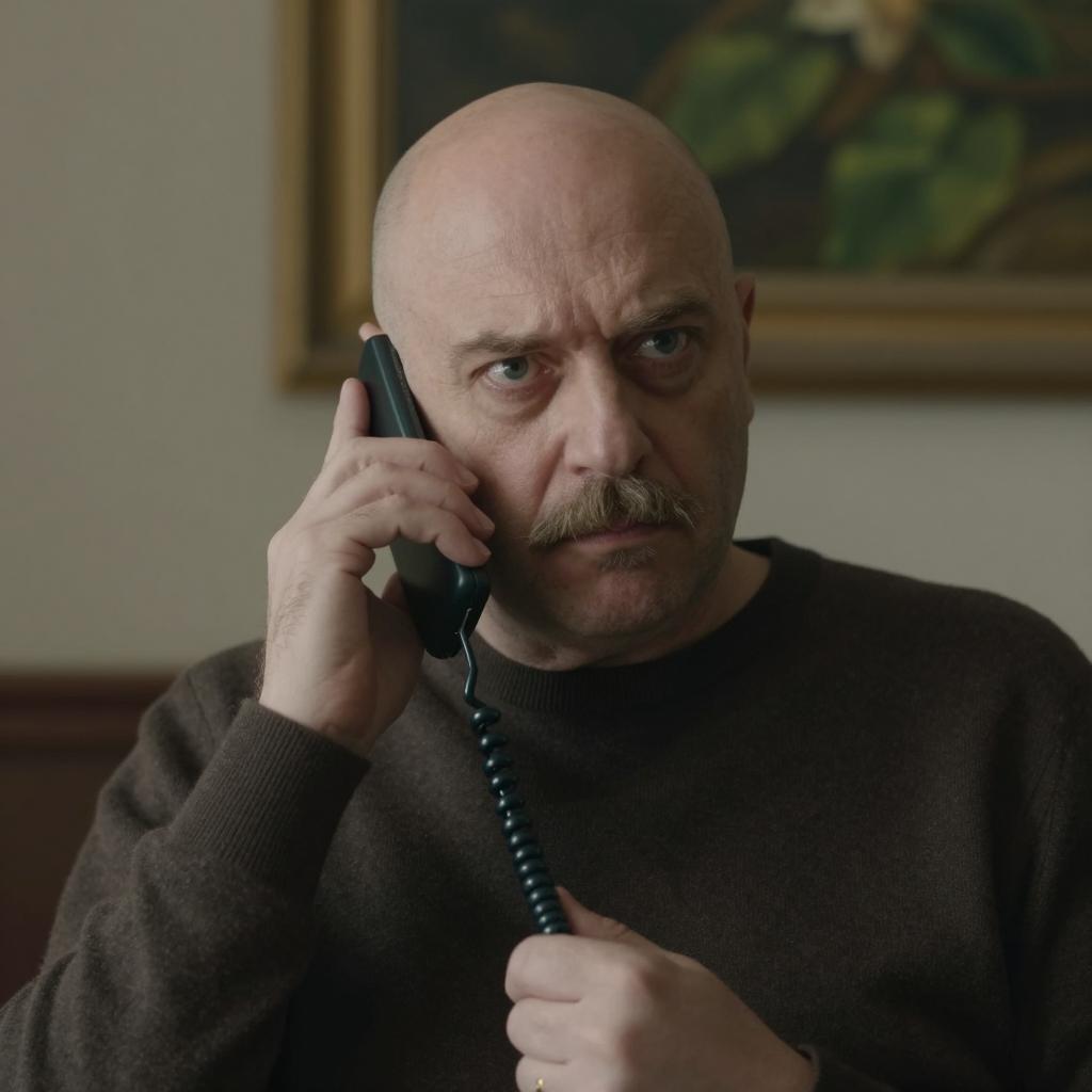 Portrait of a middle-aged bald man with a thin mustache wearing a dark brown sweater, holding a black corded phone to his ear with an intense expression. The background features a dimly lit wall and a framed painting with green foliage.