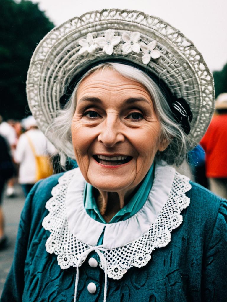An elderly woman wearing a humorous vintage costume, featuring a black dress with white lace collar, a colorful floral scarf, round glasses, and a black bow in her curly gray hair, smiling at a cosplay or costume festival outdoors.