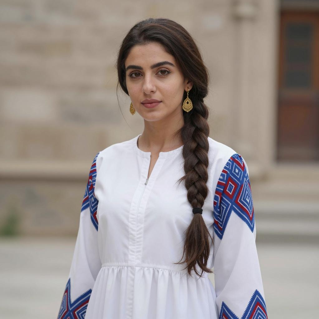 Persian costume female, photorealistic portrait of a young woman, long braided dark brown hair, brown eyes, wearing traditional long-sleeve white dress with blue and red patterned sleeves, gold earrings, standing in front of blurred stone background, soft natural light, neutral expression, bokeh effect, detailed ures, realistic shadows and highlights, slight depth of field, traditional clothing, focus on face and upper body