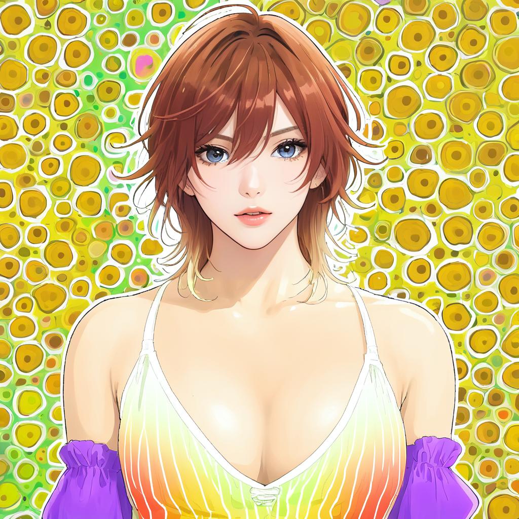 Digital anime-style illustration of a young woman with short brown hair and brown eyes wearing a colorful patterned sleeveless dress with white ruffled off-the-shoulder sleeves and a pink bow at the waist. The character has a subtle expression and visible collarbone.
