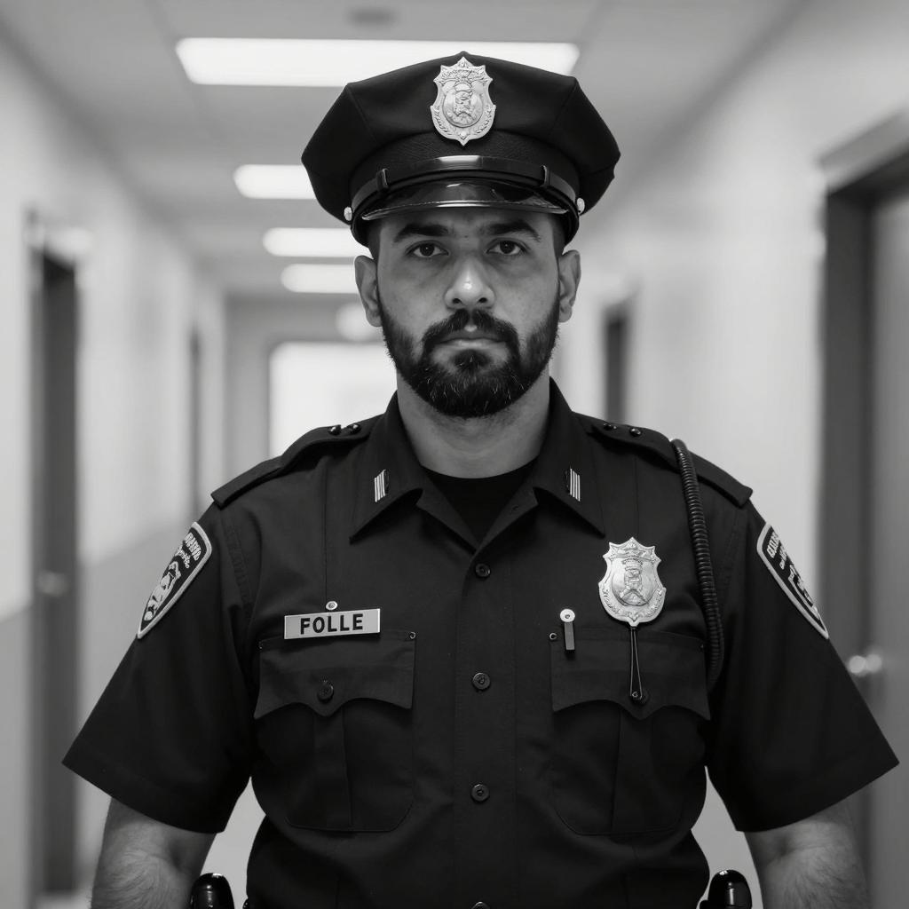 Black and white photograph of a male police officer standing in a hallway. He has a serious expression, dark beard, and wears a police cap with a badge. His uniform has shoulder patches, a name tag, and buttoned pockets. Background shows blurred hallway with light panels.