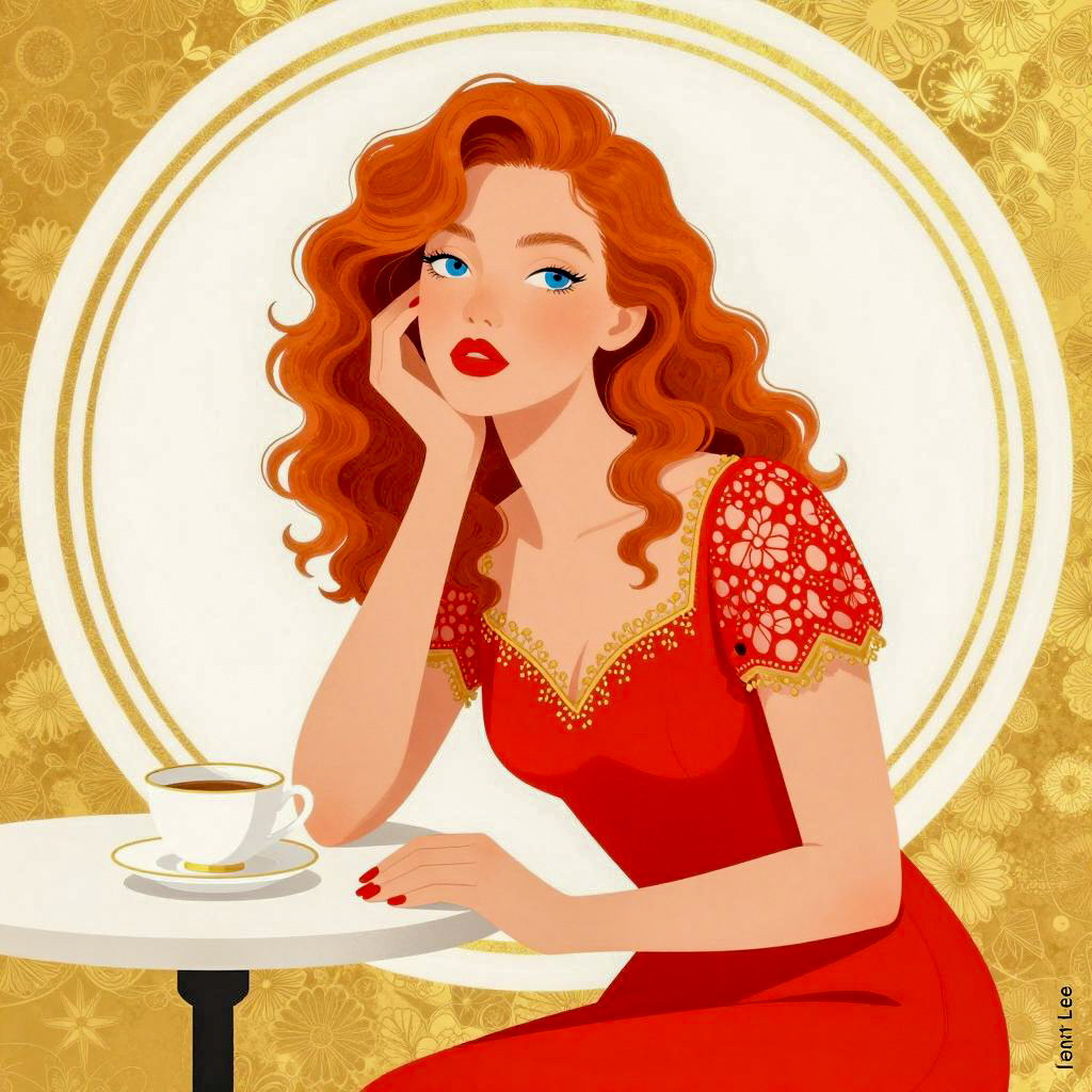 Illustration of a pale-skinned woman with red curly hair, blue eyes, and red lipstick. She leans on her right hand, head tilted slightly upward. She wears a red dress with gold lace sleeves and a white teacup on a small round table in front of her. Background has gold and white circular patterns. Her left hand rests on her lap. Artist's "Janet Lee Art" in bottom right.