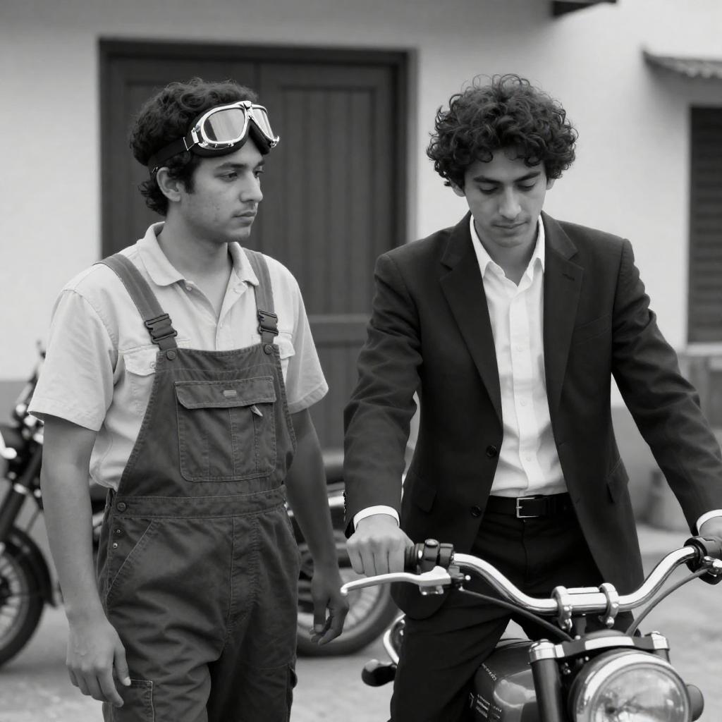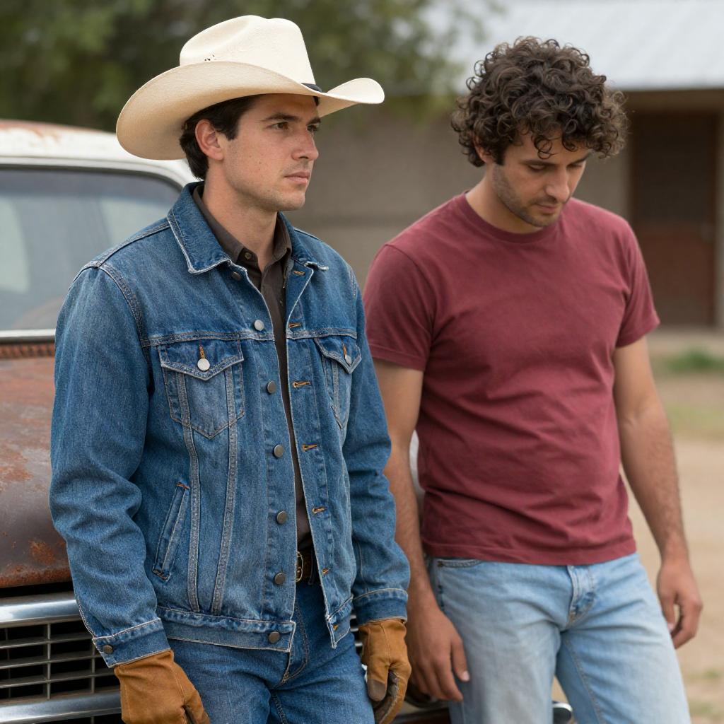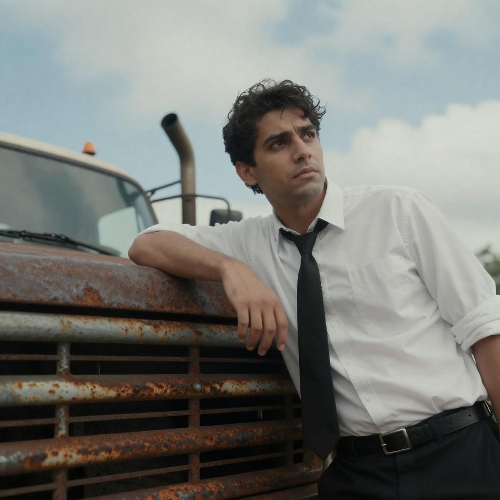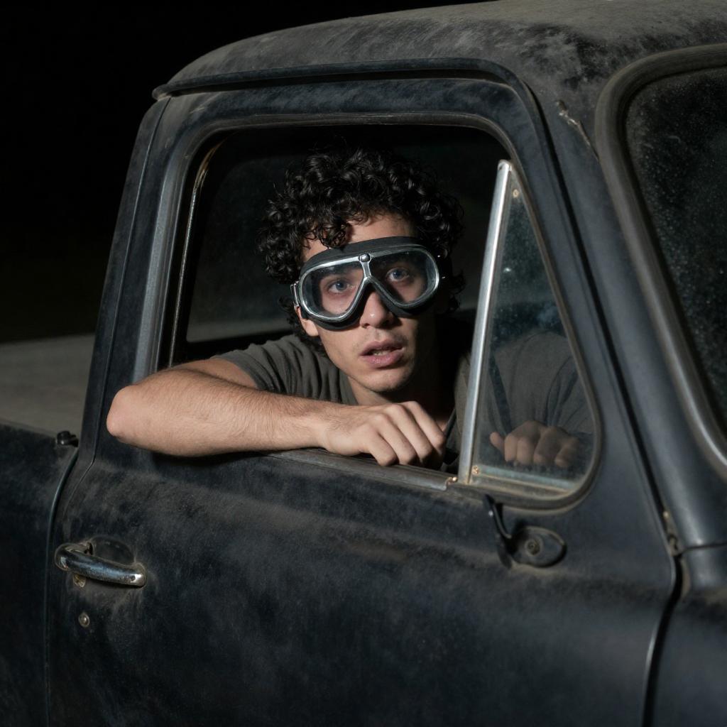 Photograph of a young man with curly black hair, wearing goggles, leaning through the broken driver's side window of a dirty, dark-colored old truck. He looks startled, gripping the window frame with both hands. Reflections and smudges on the window. Dim, shadowy background.