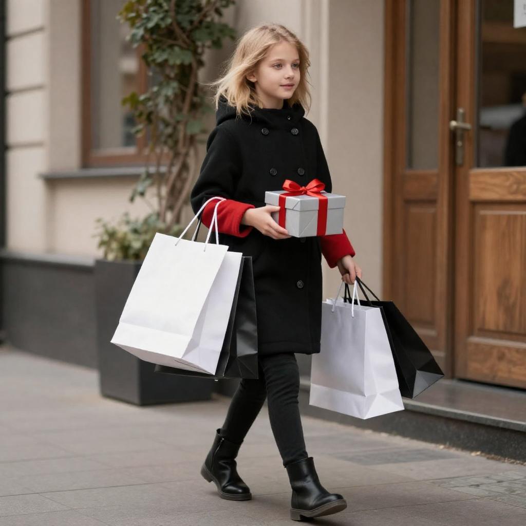 Photograph of a young blonde girl with fair skin wearing a black hooded coat featuring red sleeves, black leggings, and black boots. She is walking on a city sidewalk in front of a wooden building decorated with green vines, carrying several white and black shopping bags along with a silver gift box tied with a red ribbon.