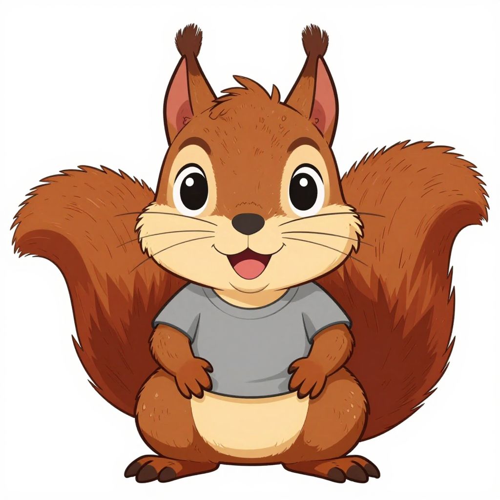 Cute cartoon squirrel with large eyes, brown fur, and a bushy tail, wearing a gray shirt, smiling with an open mouth. Digital illustration