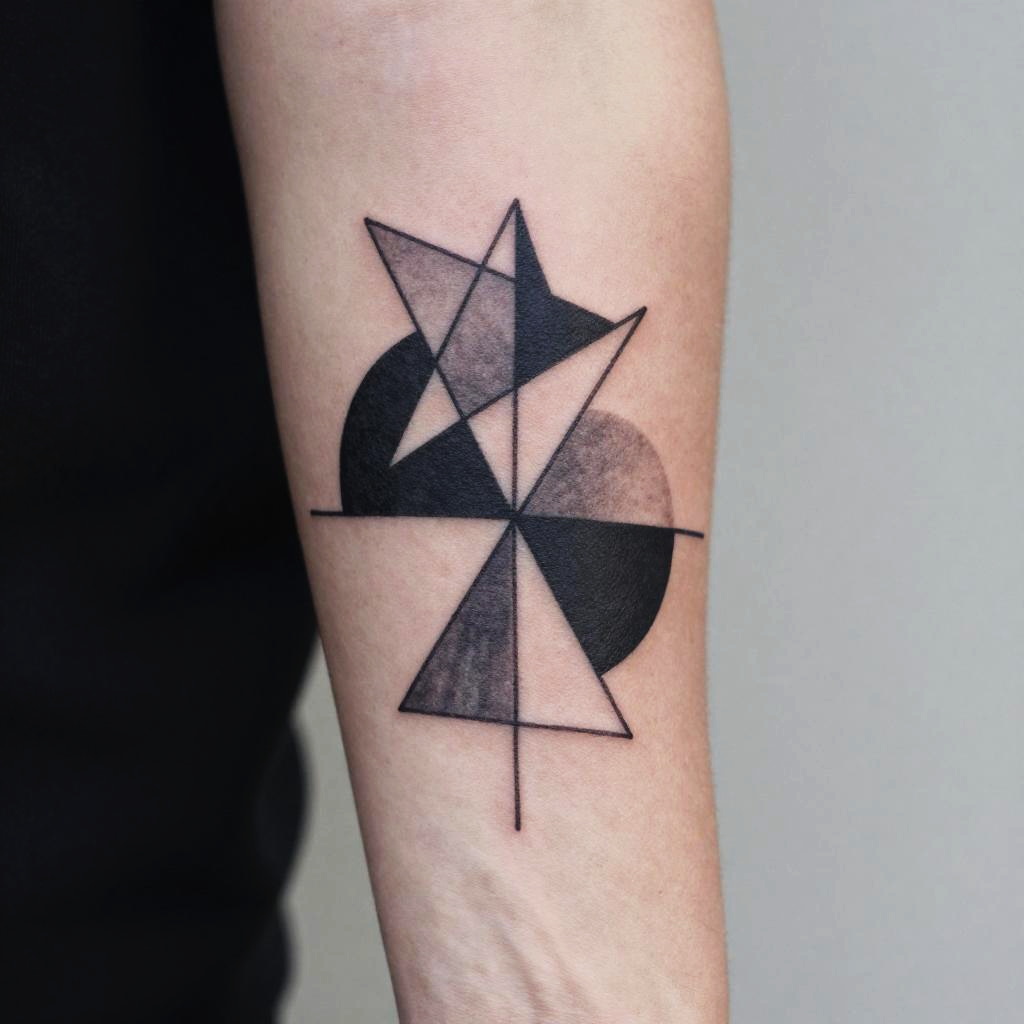 Tattoo:o_daq5tdrck= abstract geometric tattoo featuring interlocking triangles and circles in black and gray ink, minimalist yet bold, placed on a forearm, clean lines with subtle shading, contemporary art inspired design