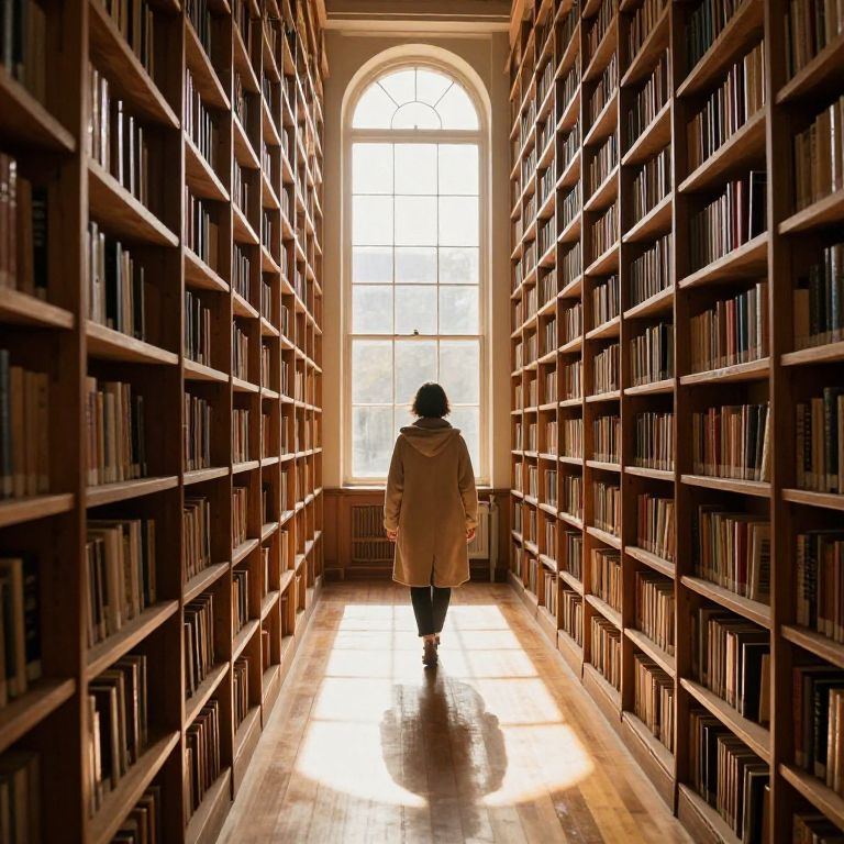 Sunlight streams through a high arched window, casting golden beams across rows of wooden bookshelves that stretch endlessly, as a solitary figure in a beige coat walks down the aisle, their shadow elongating on the polished wooden floor beneath them.