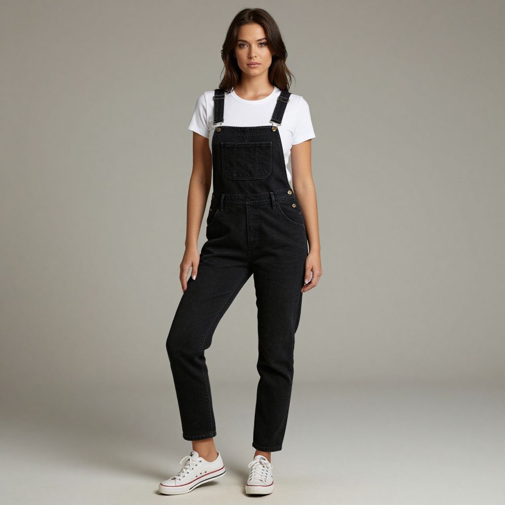 Photograph of a young woman with long, dark brown hair and light skin. She stands against a plain gray background, wearing a white short-sleeve t-shirt under black denim overalls with side pockets. The overalls have a simple, clean design and she pairs them with white low-top sneakers that have black stripes. Her stance is relaxed, with one arm hanging by her side and the other slightly bent at the elbow. The lighting is even, highlighting her casual, stylish look.