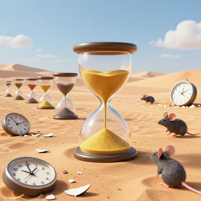 In a surreal 3D-rendered desert landscape, a procession of hourglasses with vibrant sands stands amidst scattered shards of broken clocks, while anthropomorphic mice explore the scene, evoking themes of time manipulation and the fluidity of past and future in a high-definition, dreamlike setting.