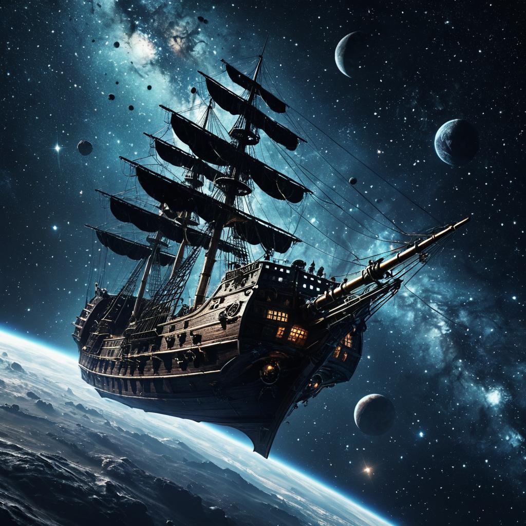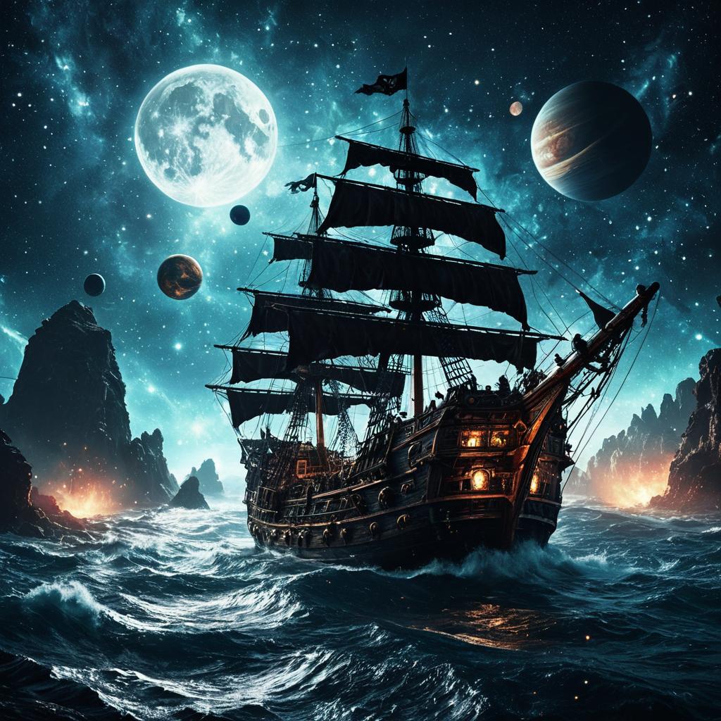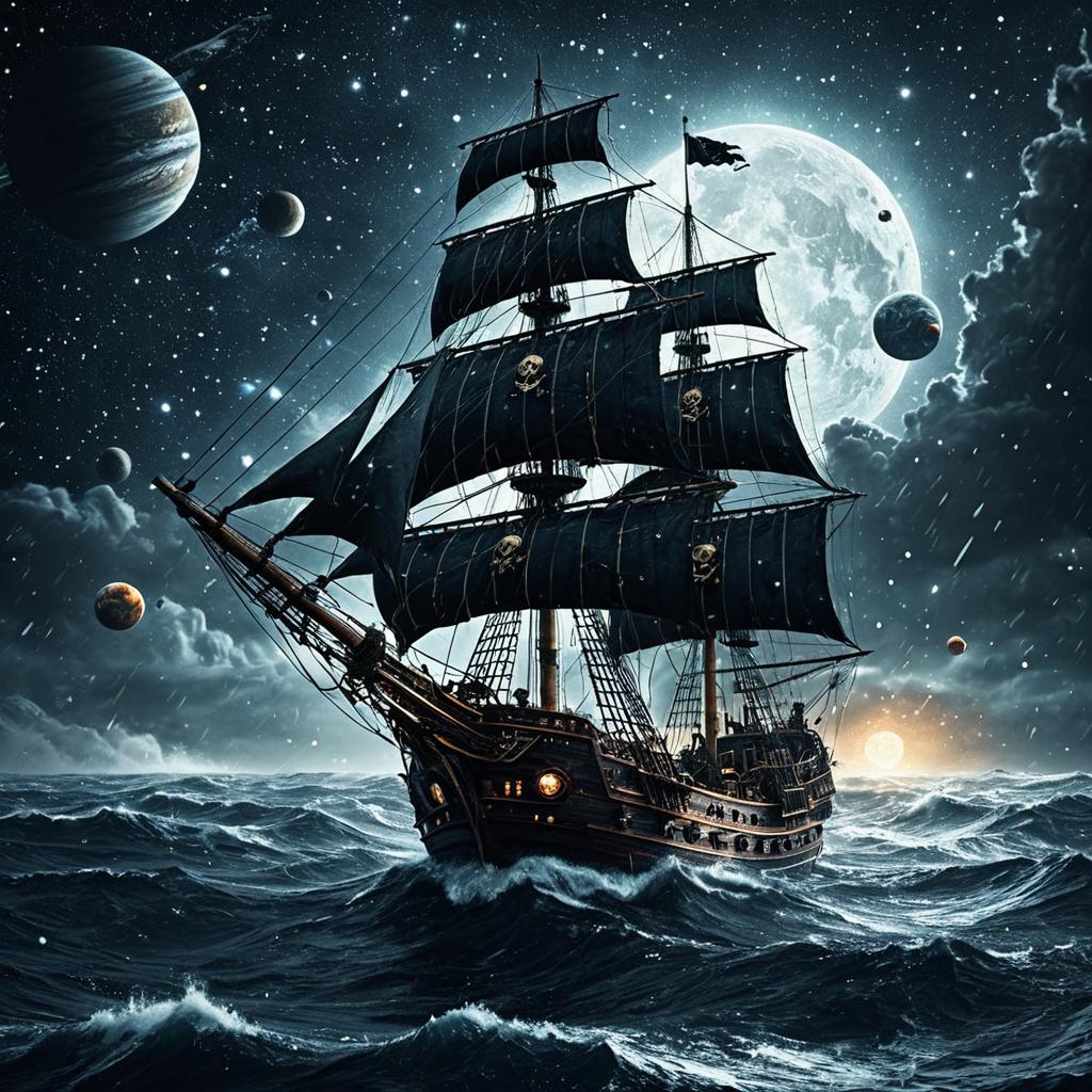 Pirate ship sailing through a cosmic nebula with swirling colorful gases. Ultra-detailed concept art, trending on ArtStation, HD quality.