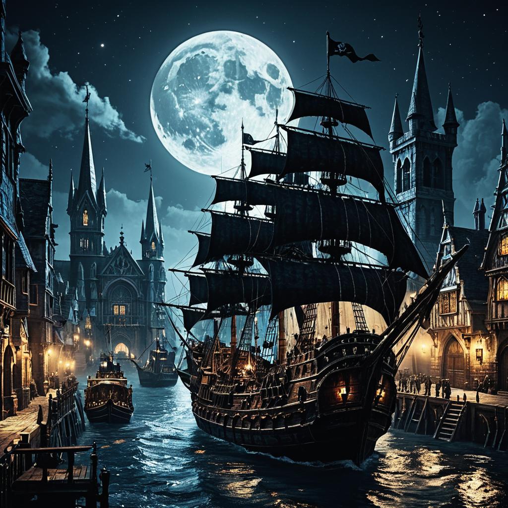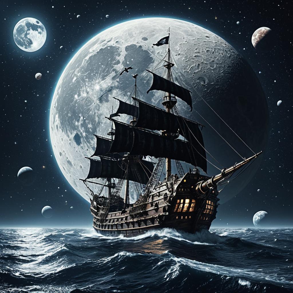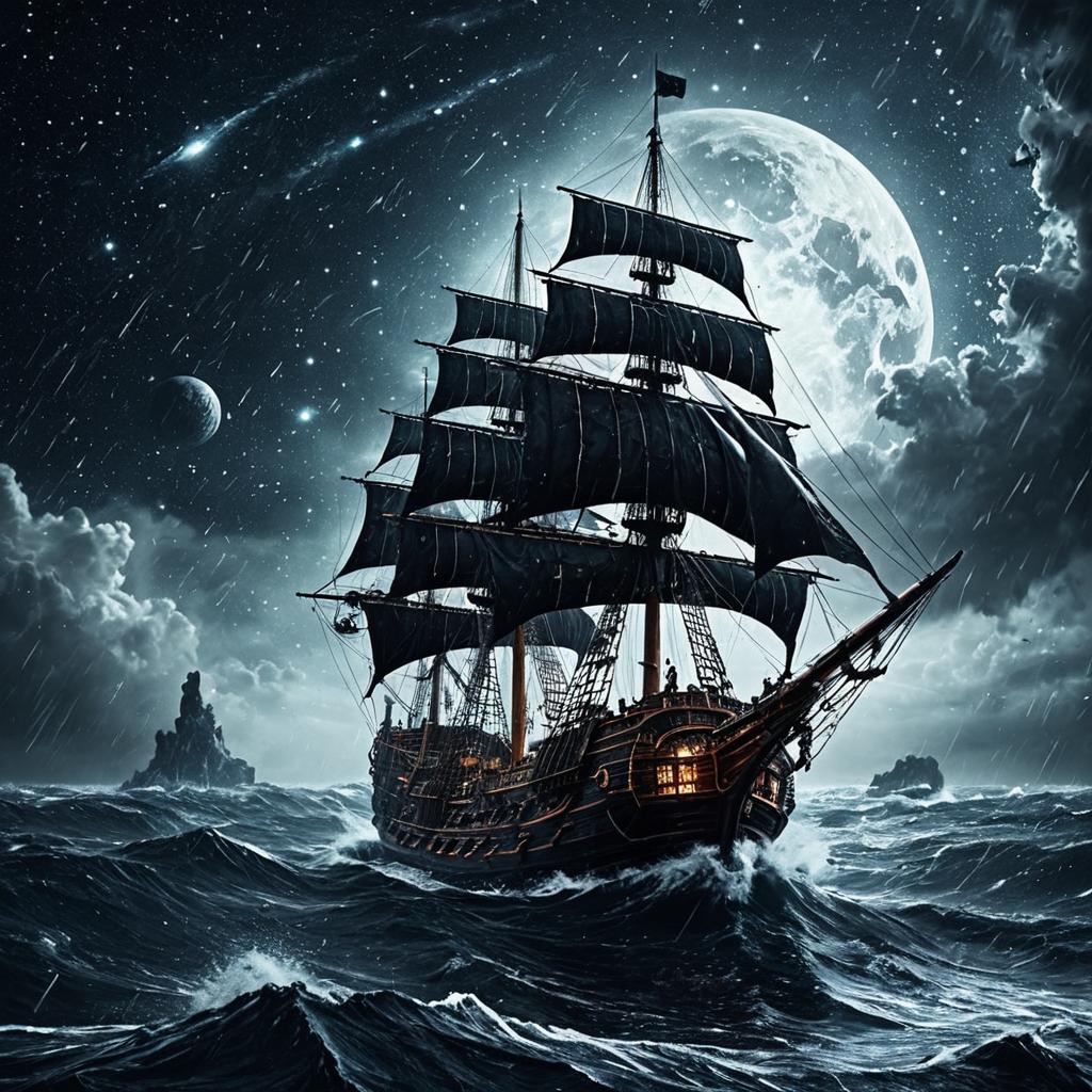 Pirate ship sailing through a cosmic nebula with swirling colorful gases. Ultra-detailed concept art, trending on ArtStation, HD quality.