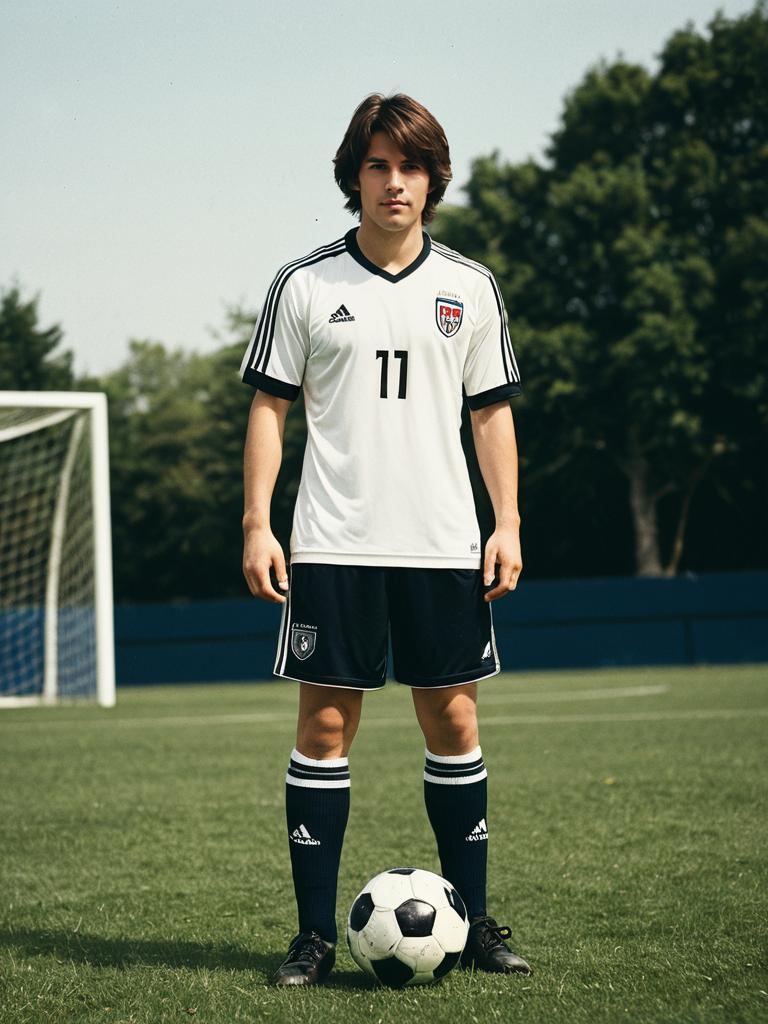 Casual football outfit, 1boy, solo, male focus, shorts, soccer, realistic, brown hair, soccer uniform, socks, sportswear, shirt, outdoors, full body