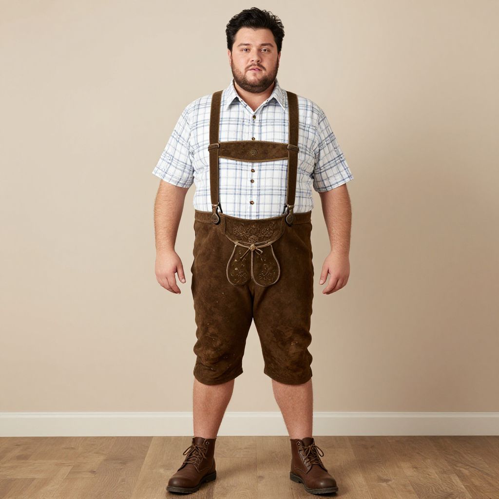 Plus size lederhosen costume, 1boy, male focus, solo, shirt, suspenders, shorts, plaid shirt, facial hair, standing, full body, brown footwear, black hair, shoes