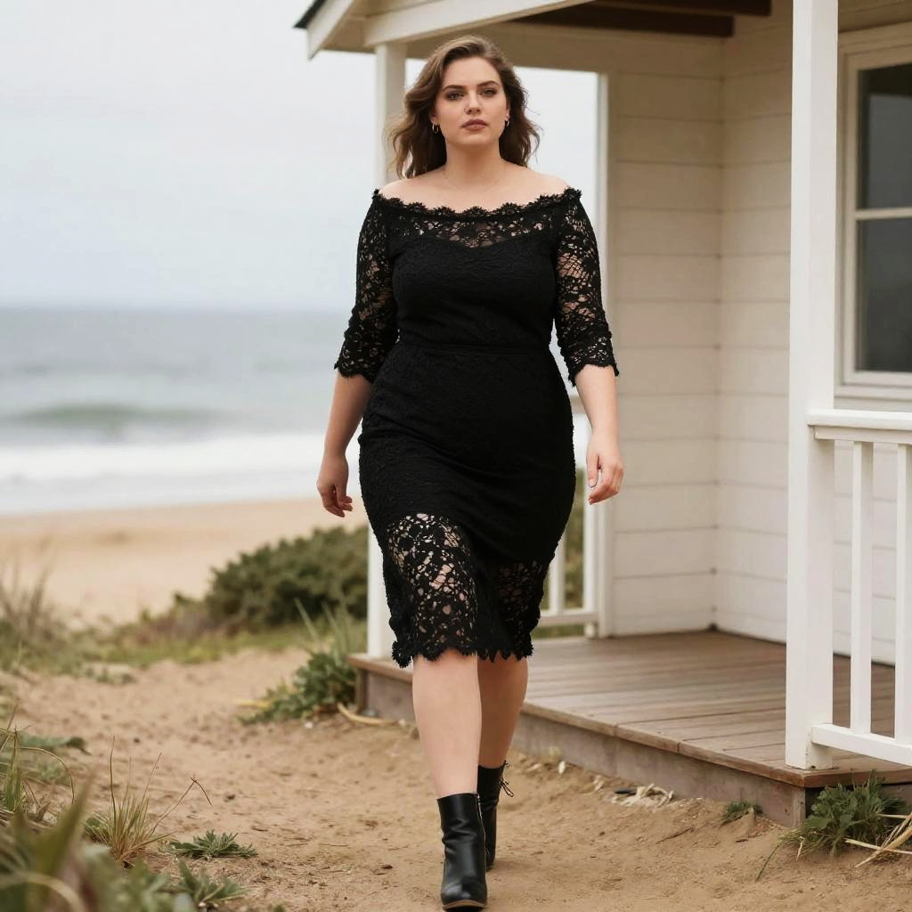 Photograph of a curvy woman with fair skin and shoulder-length, wavy brown hair, wearing an off-the-shoulder, black lace dress that reaches her knees and black ankle boots. She stands confidently in front of a white wooden beach house with a porch, walking on a sandy path with grassy patches. The background features a blurred, overcast beach scene with gentle waves. The woman's expression is neutral, and she casts a slight shadow on the ground. The image has a soft focus, emphasizing her figure and the lace texture of her dress.