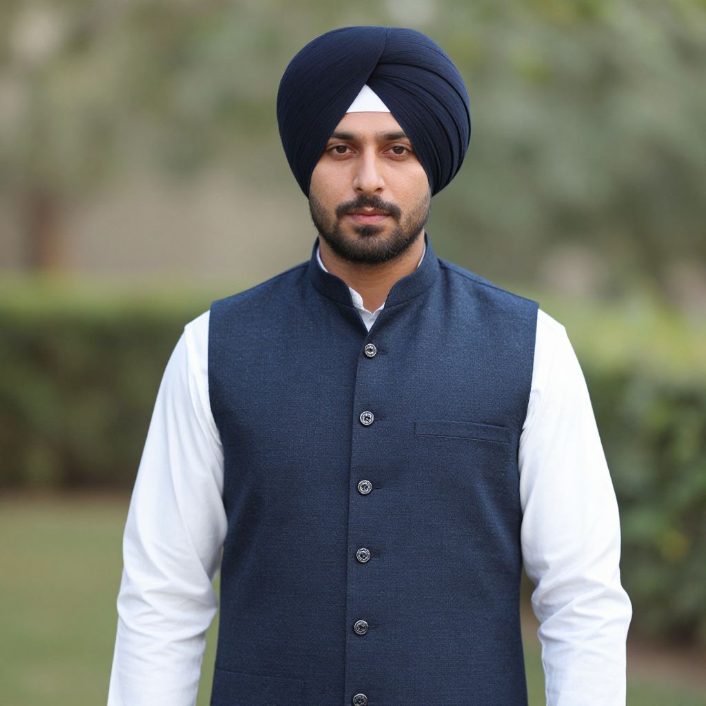 Photograph of a South Asian man with medium brown skin and black beard, wearing a navy blue turban and a matching sleeveless vest over a white long-sleeve shirt. He has a serious expression with dark eyes and full lips. The background is blurred, featuring greenery with trees and bushes, indicating an outdoor setting. The man's attire and turban suggest traditional or cultural dress. The photograph has a sharp focus on the man, with a soft bokeh effect in the background.