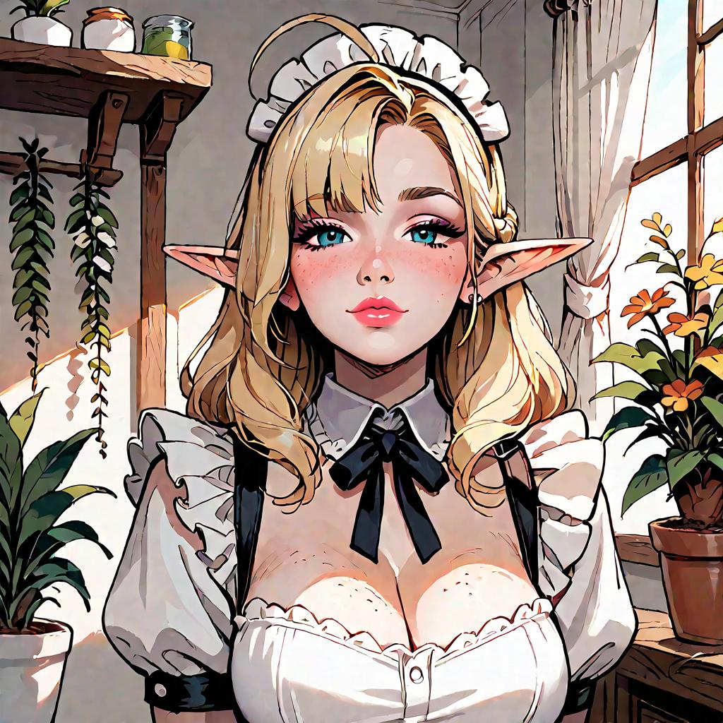 Score_9, score_8_up, score_7_up, score_6_up, source_anime, rating_safe, 1girl, mature_female, maid, elf, pale skin, blonde hair, multicolored hair, ahoge, freckles, elf ears, smile, large breasts, close up, looking at viewer, greenhouse, potted plant