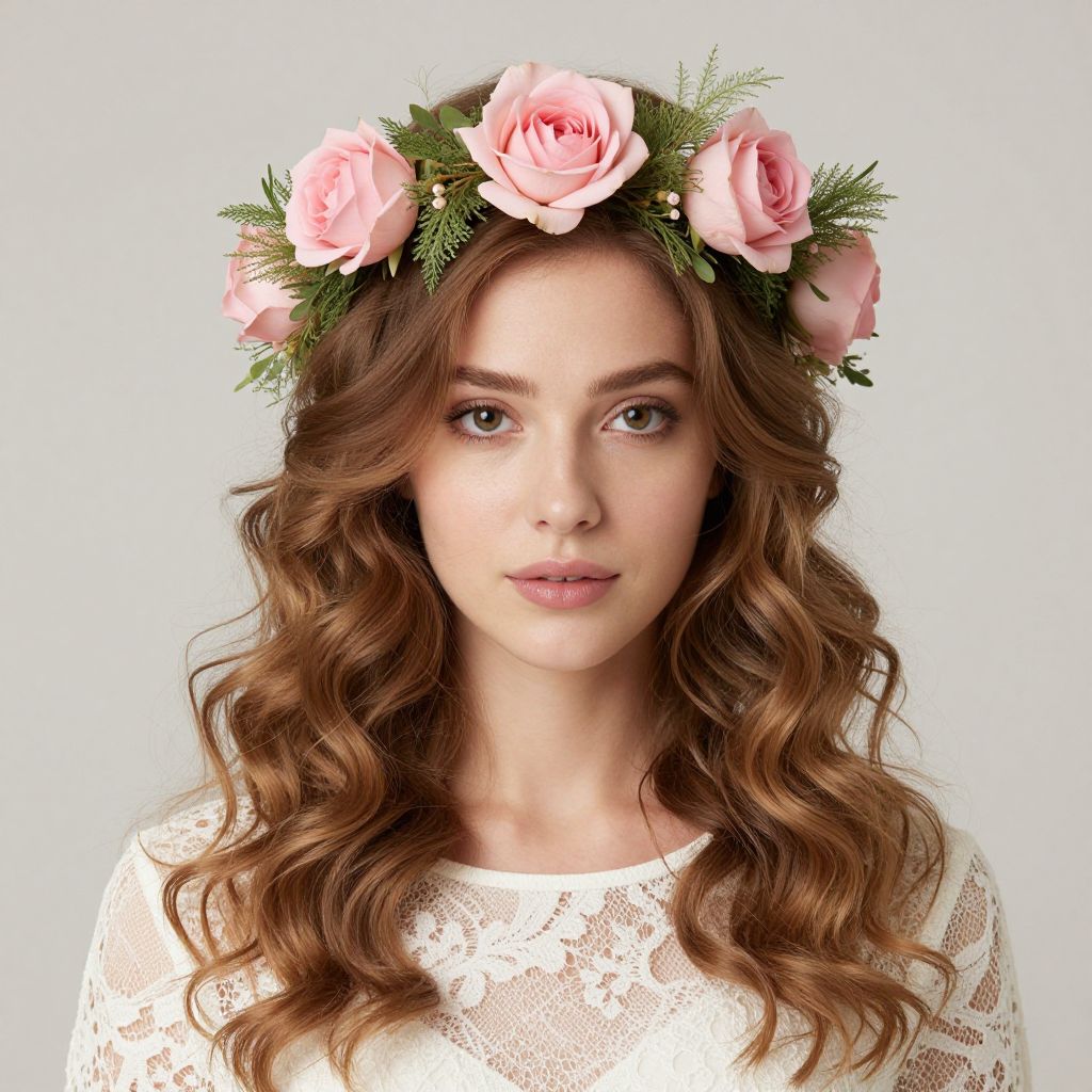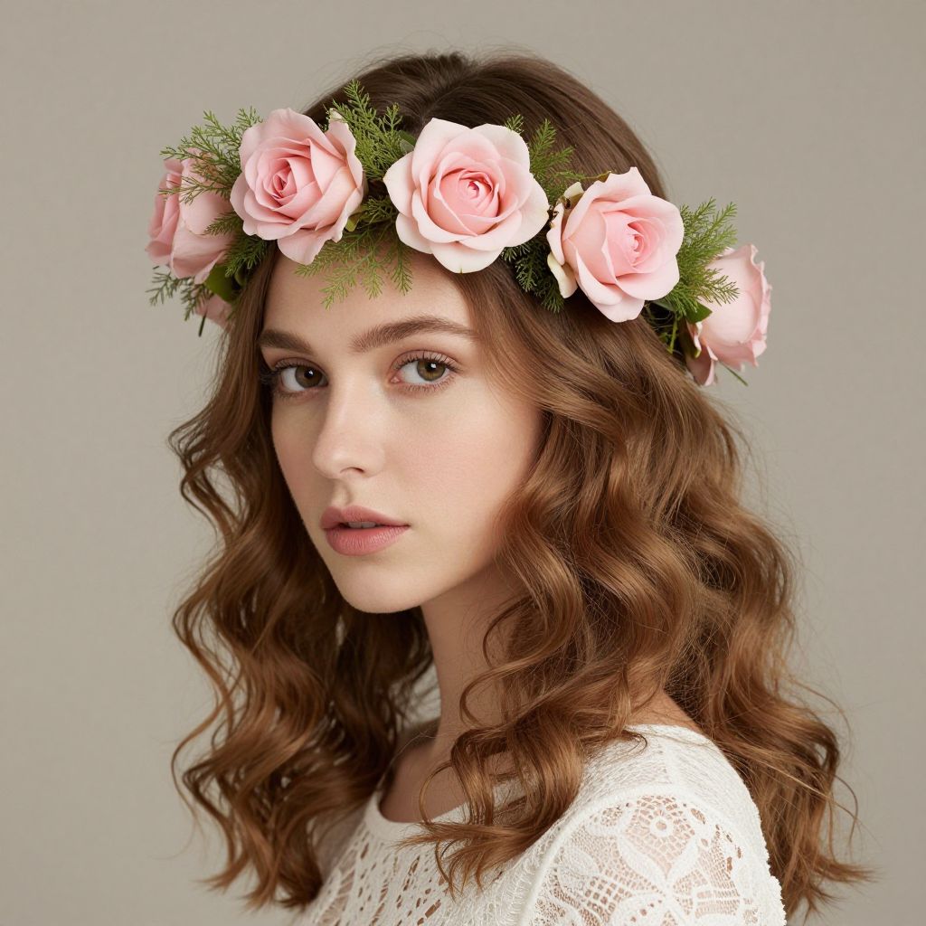 Woman wearing a delicate pink flower crown adorned with three soft pink roses and green foliage, complementing her light brown wavy hair and a white lace top against a neutral background.