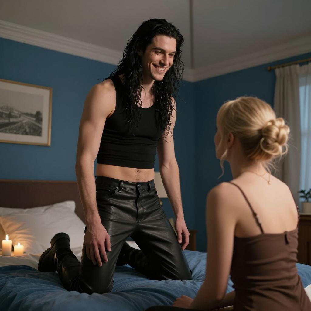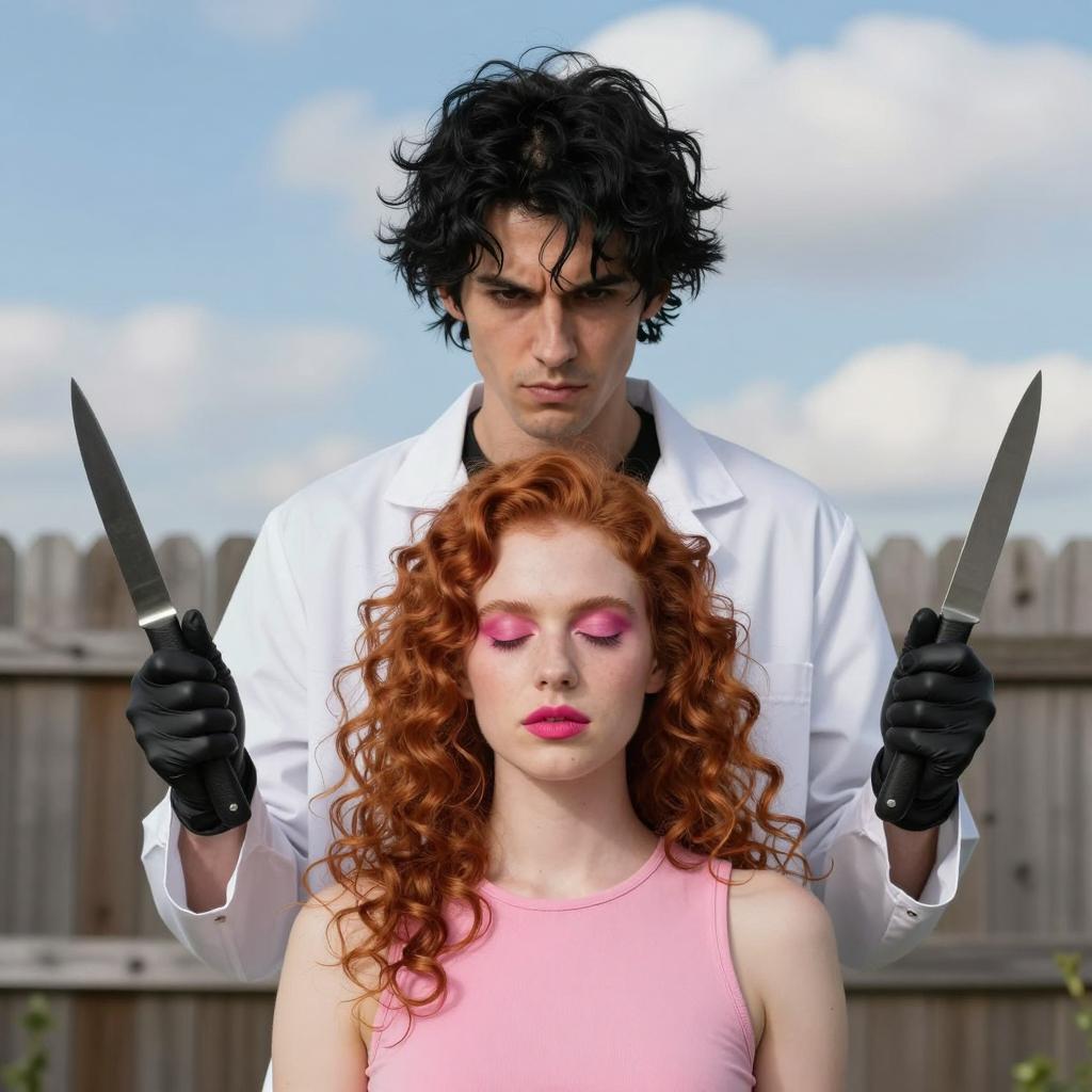 Two people. Dark-haired man with pale face, black makeup, and curly hair stands behind a red-haired woman with bangs. Man's arm around woman's shoulder, both facing forward. Woman's eyes closed, man's eyes downcast. Background has dim lighting and blurred objects. Man wears dark, ured clothing. Woman's hand on man's arm. Christmas lights in background. Two people.