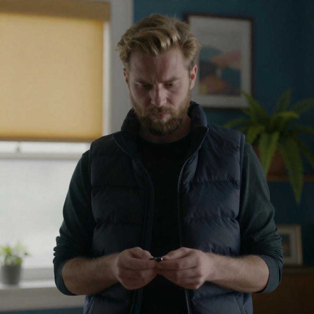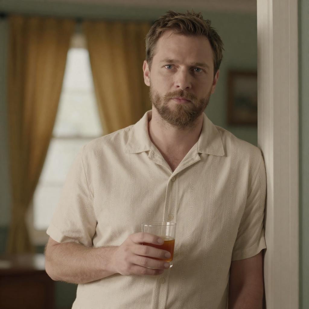 Photograph of a man with short brown hair and a light beard, standing in a doorway, holding a glass of brown liquid. He wears a beige, short-sleeved, button-up shirt with vertical chain patterns. Background includes a blurred window with yellow curtains. He has a serious expression. Right side of his body leans against the door frame. Sunlight illuminates his face from the left.