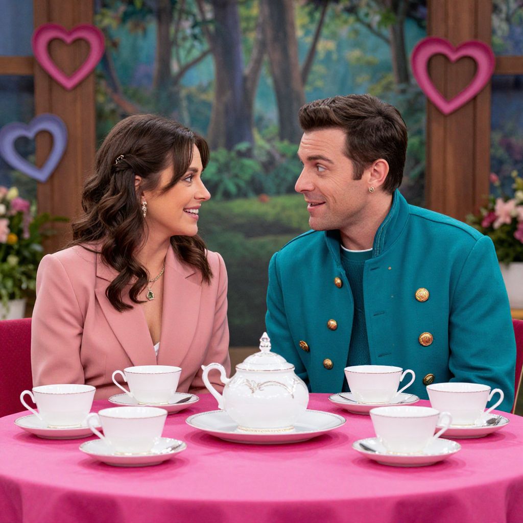 Elegant tea cups and saucers rest on a vibrant pink tablecloth as two characters—a woman in a pink blazer and a man in a teal jacket adorned with gold buttons—share a whimsical moment, surrounded by heart-shaped decorations and a forest backdrop.