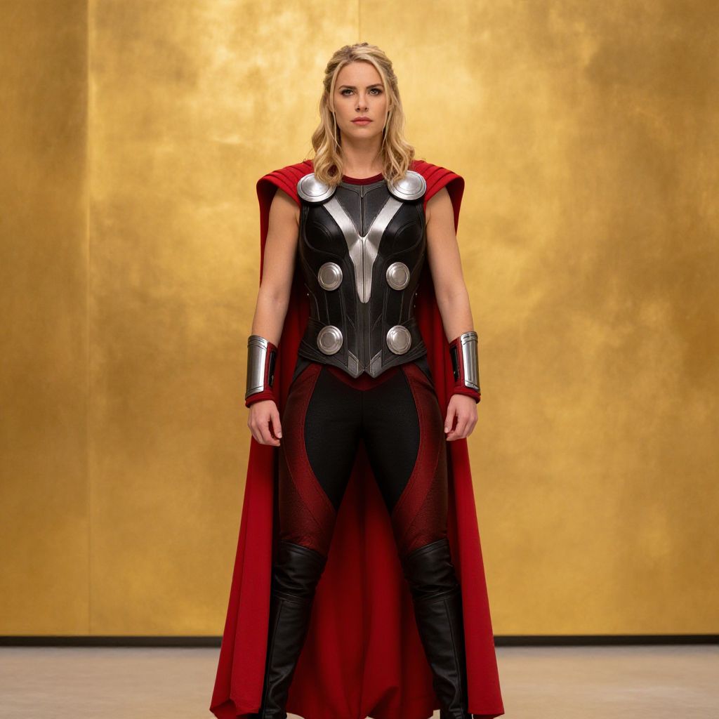 "Thor Love, woman in red and black outfit standing in front of a golden wall"
