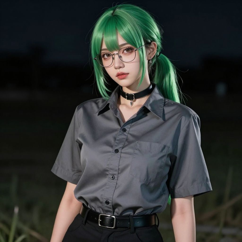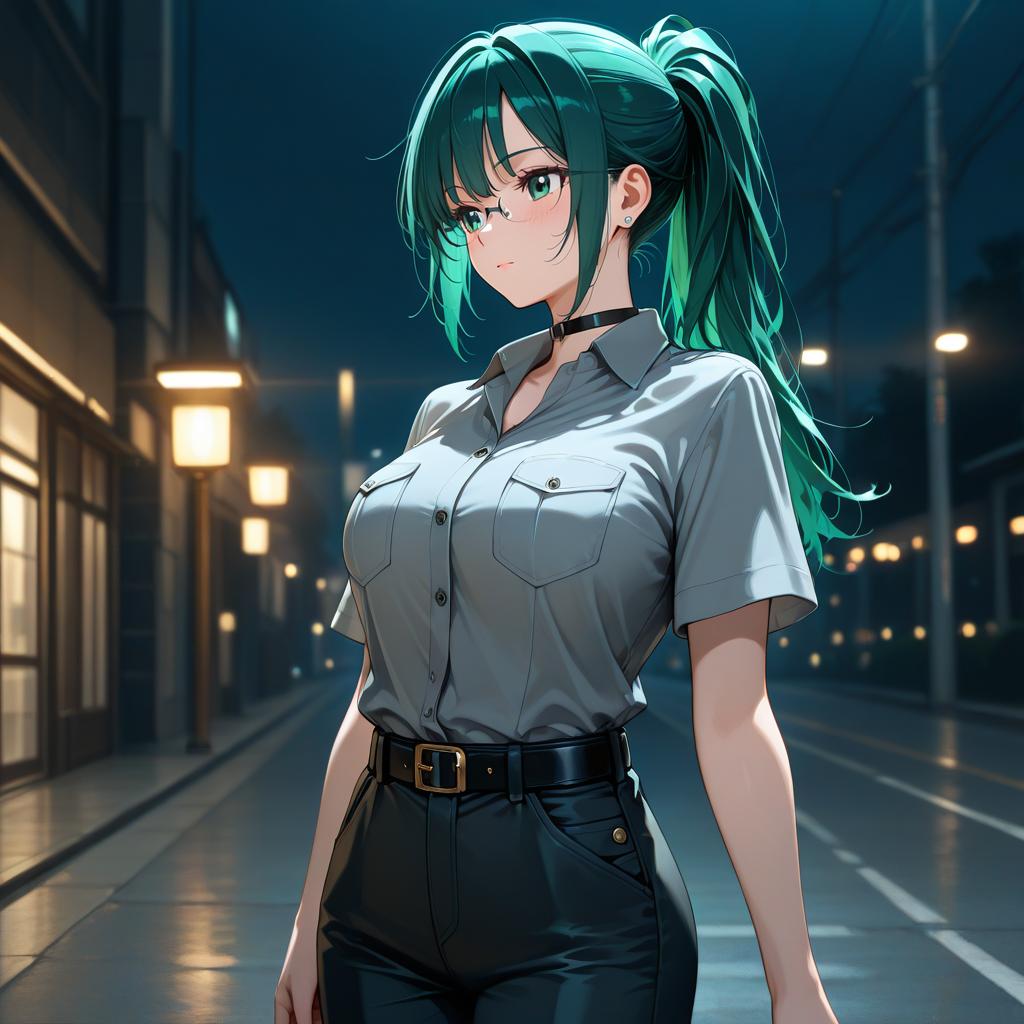 1girl, cowboy shot, beautiful, zenin_maki, ponytail, glasses, bangs, green hair, brown eyes, shirt, outdoors, belt, choker, collared_shirt, pants, black_belt, black_choker, breast_pocket, earrings, grey_shirt, night, pocket, shirt_tucked_in, short_sleeves, volumetric lighting, best quality, masterpiece, intricate details, tonemapping, sharp focus, hyper detailed, trending on Artstation