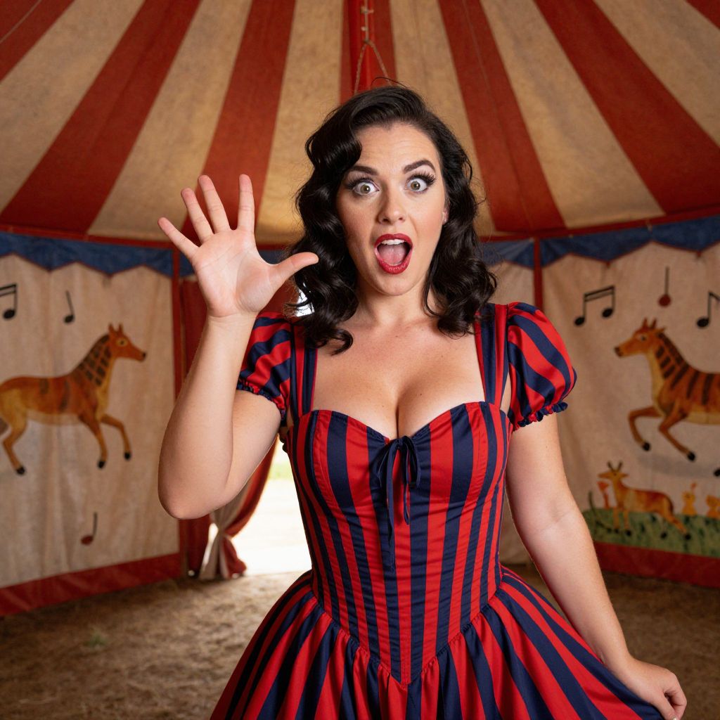 Photograph of a shocked woman with black curly hair, wearing a red and black striped vintage dress, waving inside a circus tent with musical notes and animal