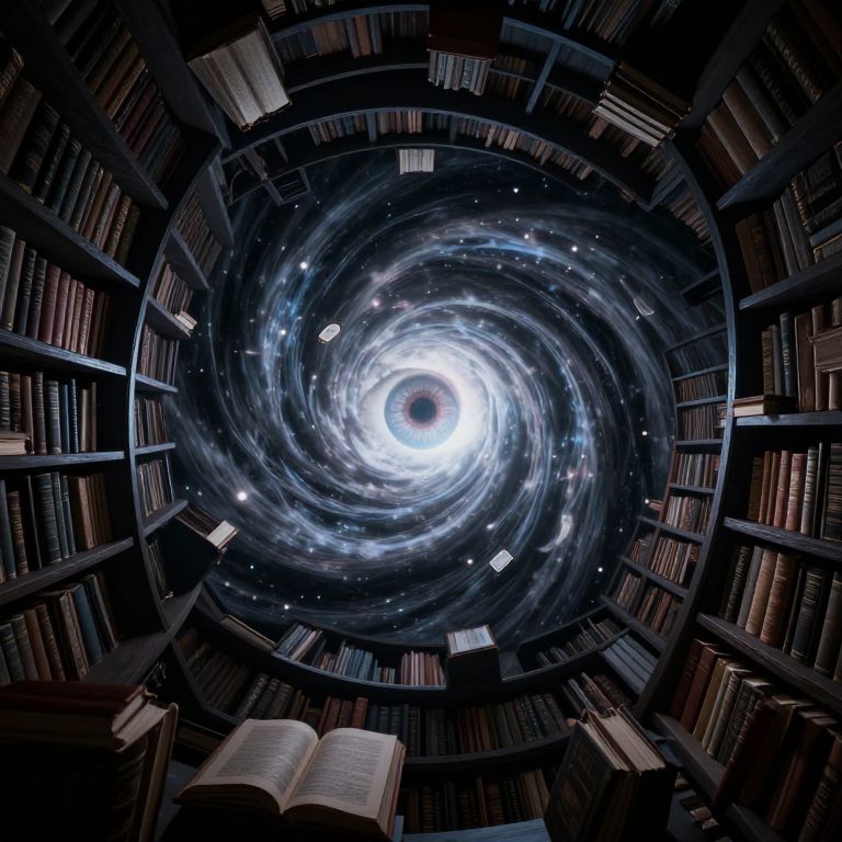 In a hauntingly surreal library, towering shelves of ancient tomes converge toward a swirling cosmic vortex, where the boundary between knowledge and the infinite dissolves into a radiant, otherworldly light.