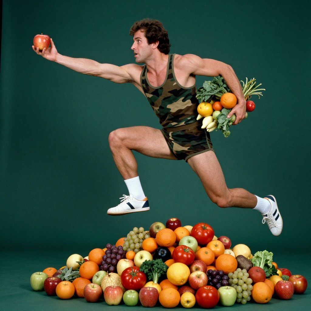 In this vibrant and dynamic image, a muscular man in a camouflage tank top and shorts is captured in mid-leap, lunging forward with intense focus and determination. His left arm is extended, reaching out to a floating apple, while his right arm is bent at the elbow, holding a cluster of fruits and vegetables. The scene is set against a deep green background, creating a striking contrast with the colorful array of fruits and vegetables below him. A large pile of various fruits and vegetables, including apples, oranges, grapes, and tomatoes, is scattered around him, adding to the sense of movement and energy. The man's athletic build and the realistic details of the fruits and vegetables, such as their textures and colors, contribute to a highly detailed and dynamic composition reminiscent of an Olympic sports competition. The overall scene is a vivid representation of a full-body, colorful, and realistic depiction of a man striving in a 1980s setting, captured with the precision of a Kodak photo.
