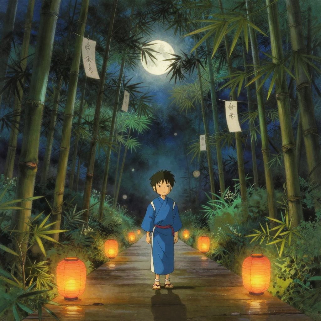 Spirited Away-inspired fantasy at a moonlit bamboo forest path; a young boy in a blue yukata stands amid glowing lanterns and fluttering paper talismans. gouache and pastel aesthetic with delicate linework, soft edges, and subtle washi texture. Cinematic composition with leading lines and a clear vanishing point, warm amber and teal grading, volumetric light, gentle fog, soft bokeh, polished wood reflections, high detail, subtle film grain, calm, wistful mood.
