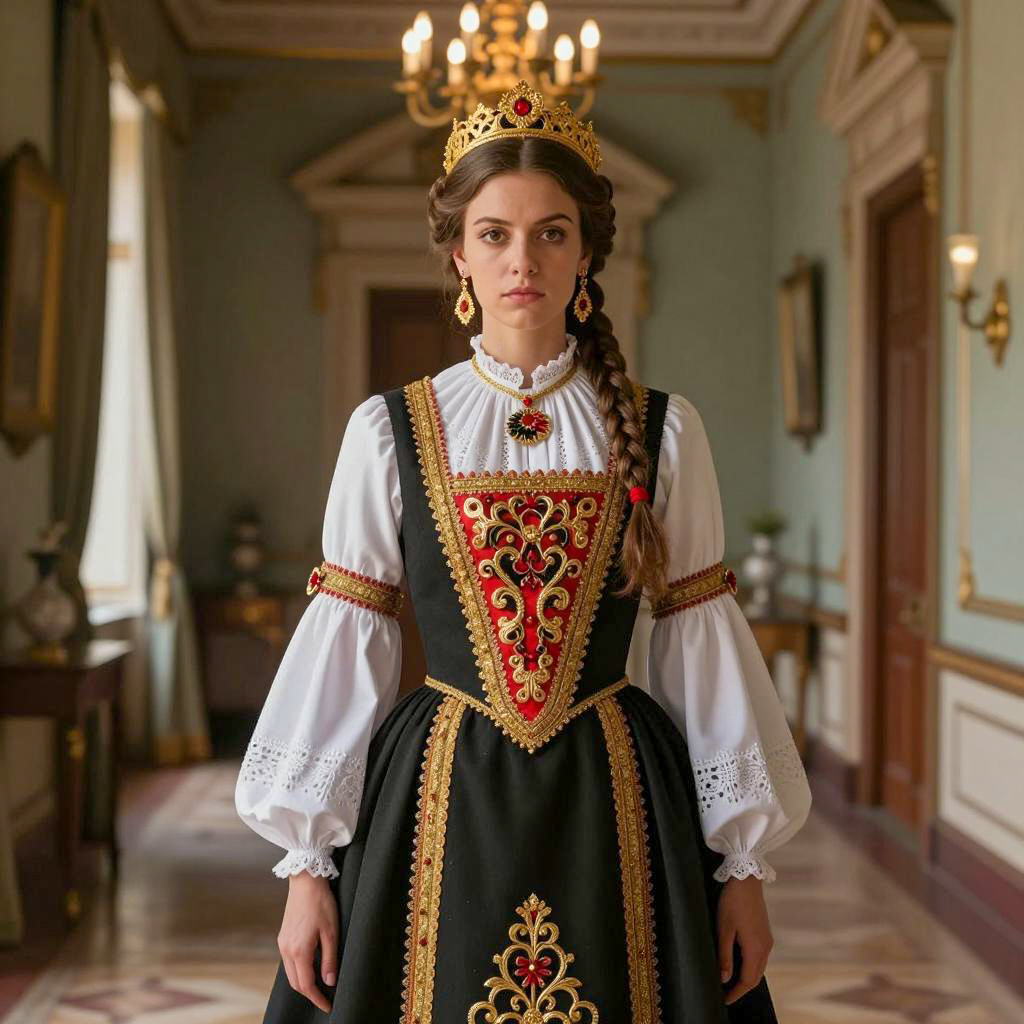 Dolores encanto dress, photorealistic, female character, standing in ornate hallway, traditional folk costume, black dress with white puffy sleeves, gold and red detailing, braided hair, gold tiara, serious expression, large earrings, chandelier in background, blurred background, rich colors, high contrast, realistic lighting, historical style, focus on character, elaborate architecture, early 20th century attire, detailed ures