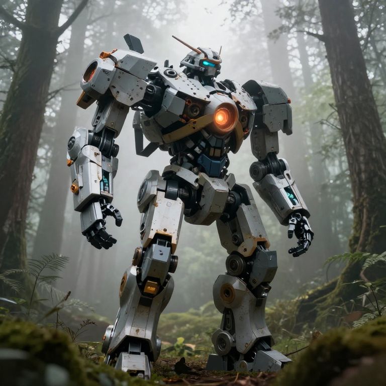 Photograph-like CGI of a large, white and silver mecha robot standing in a foggy forest. The robot has a bulky, humanoid shape with multiple jointed limbs, glowing orange eyes, and an orange glowing chest light. It features various mechanical details, such as panels, wires, and small orange lights. The forest background includes tall, mist-covered trees and green ferns on the forest floor, creating a mystical atmosphere. The mecha's design is reminiscent of a futuristic, robotic warrior, with a sleek yet rugged appearance. The lighting is soft, with beams of sunlight filtering through the trees.