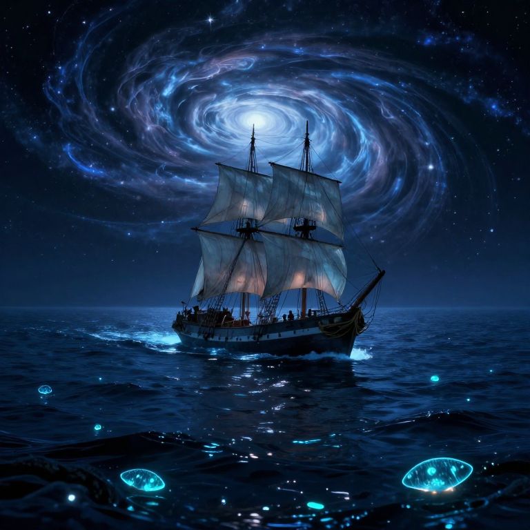 A breathtaking seascape emerges under a swirling celestial display, where an aged sailor navigates his weathered vessel through shimmering waters teeming with glowing marine life. This scene marries the serene beauty of classic seascapes with the enigmatic allure of cosmic horror tales, capturing both wonder and unease. The ship appears diminutive against the expansive ocean, while eerie light from the celestial event casts an otherworldly glow upon the deep, mysterious depths below. As the sailor charts his course through these uncharted waters, one cannot help but feel humbled by nature's grandeur and unsettled by its hidden mysteries.