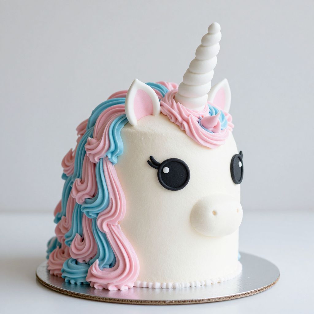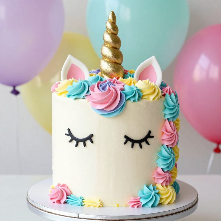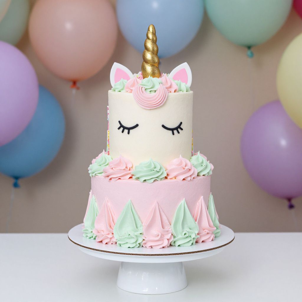 A whimsical unicorn-themed cake bursts with magical charm, adorned with pastel frosting swirls, golden horn, and dreamy closed eyes, set against a backdrop of floating balloons in a surreal celebration of fantasy.