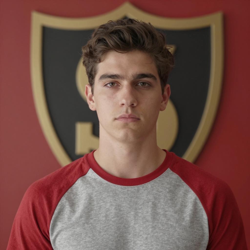 Close-up photograph of a young man with fair skin, blue eyes, and brown hair. He has a small mustache and wears a red shirt with a blue collar. His expression is slightly concerned. Background is blurred, dark blue.