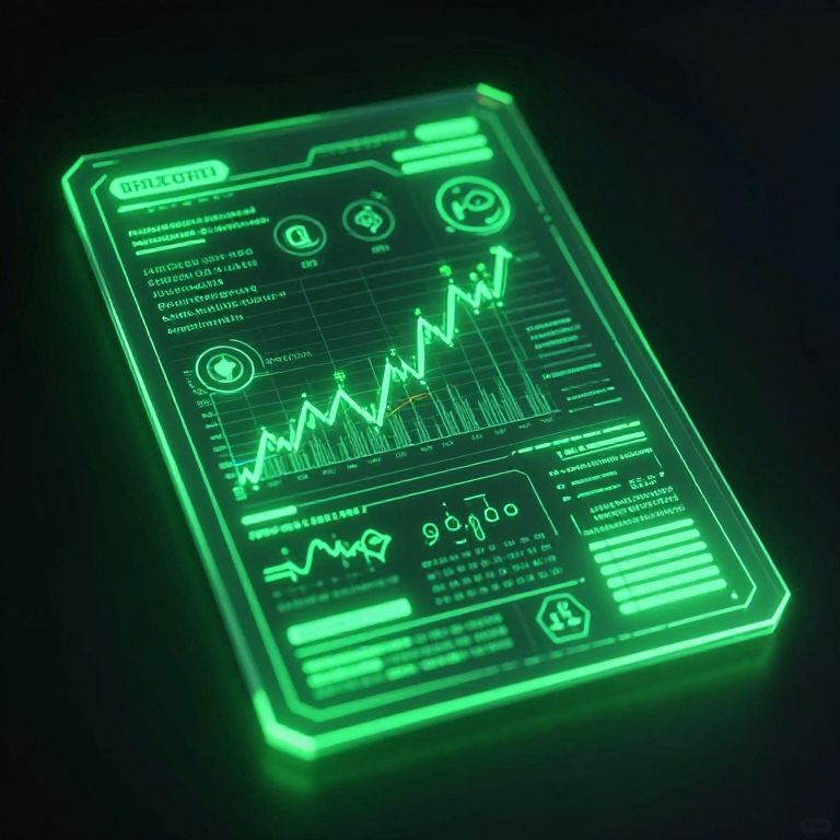 Greensheet design, futuristic data sheet glowing in neon green, floating holographic display with dynamic financial icons and data streams, dark background with high contrast lighting, cyberpunk aesthetics, highly detailed visualization