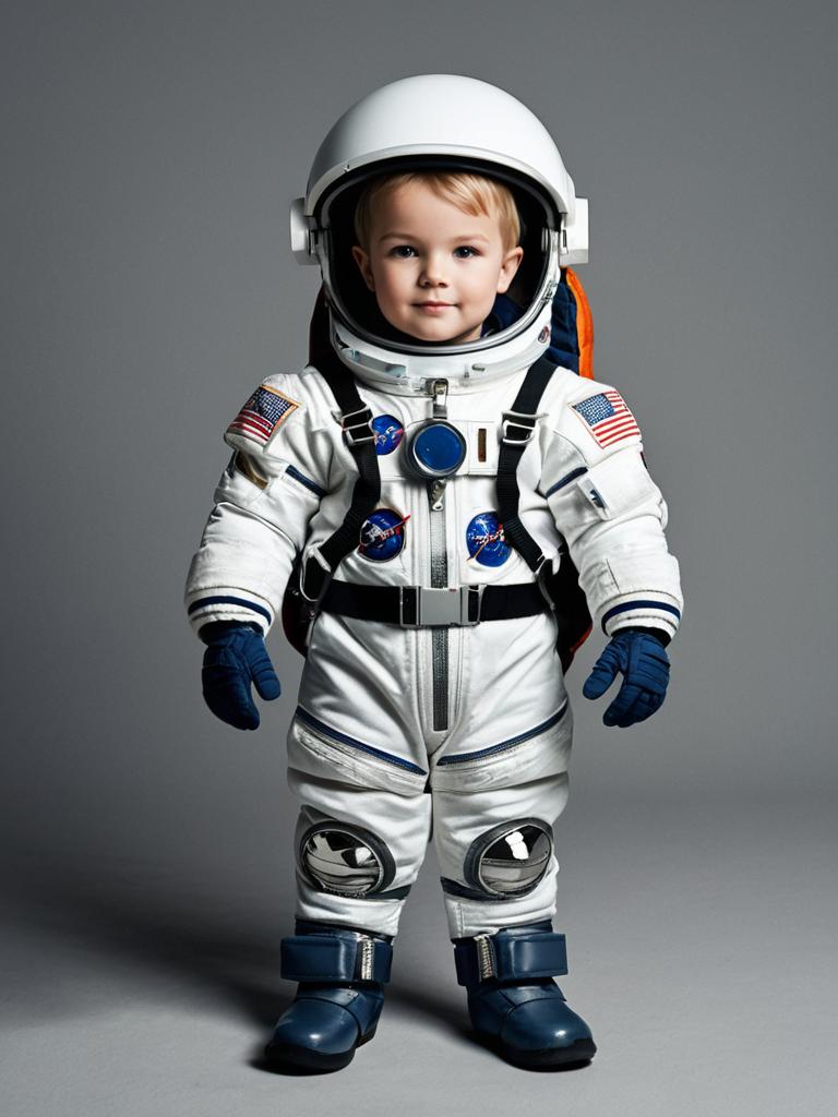 Toddler astronaut costume, solo, 1boy, male focus, full body, helmet, standing, realistic, looking at viewer, astronaut, simple background, spacesuit, grey background, arms at sides, belt