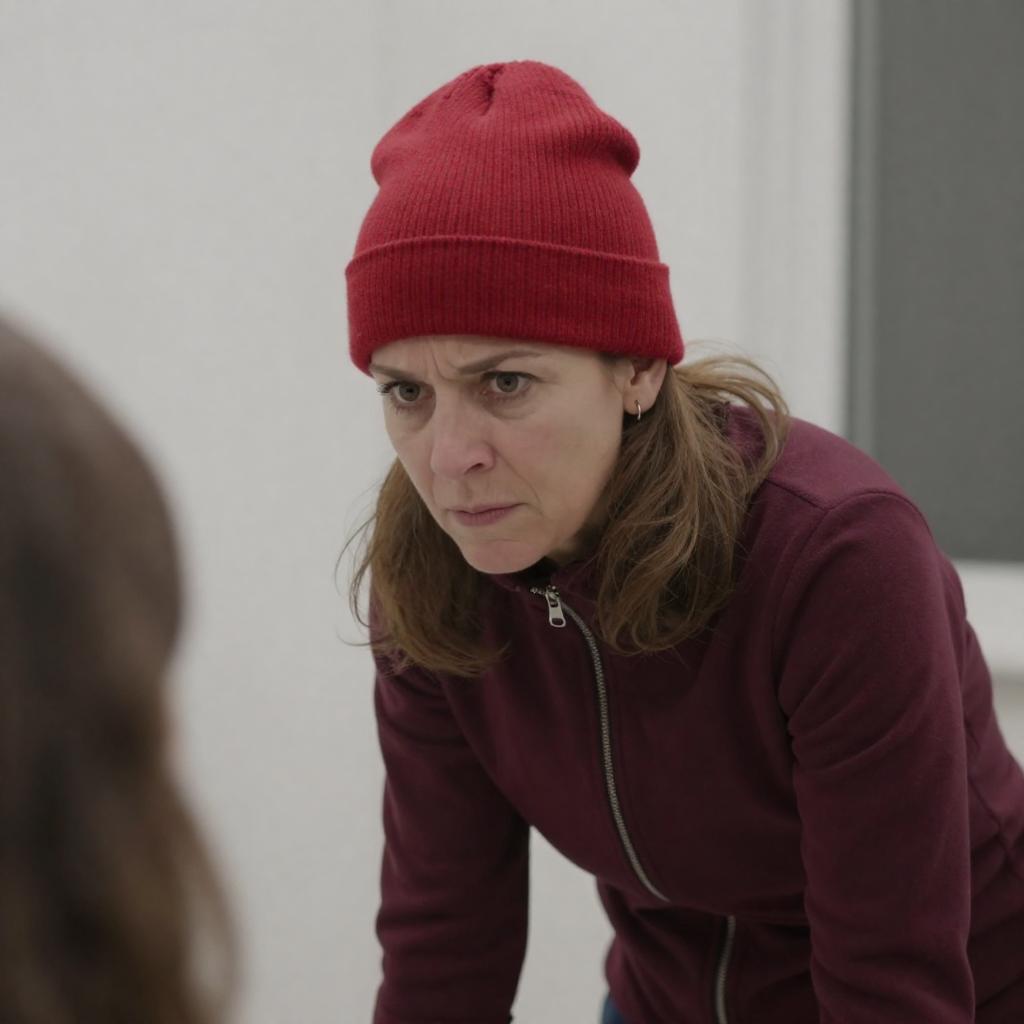 Middle-aged woman with fair skin, red knit hat, and maroon zip-up jacket leaning forward, intense expression, slightly disheveled brown hair. Background shows a white wall and a window. Foreground has blurred brown hair of another person. Indoor setting.