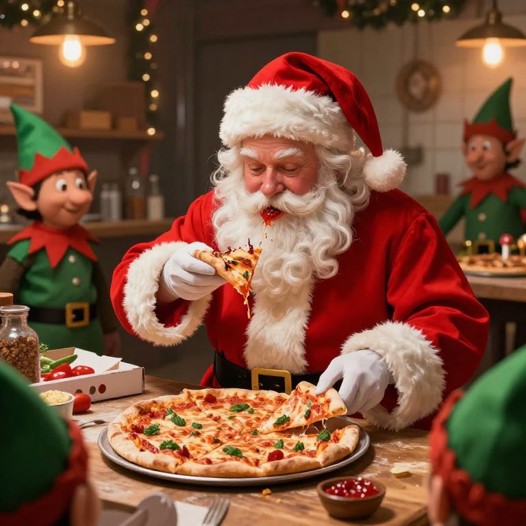 Santa eating pizza in his workshop surrounded by playful elves, scattered pizza boxes and ingredients, lively and cheerful scene, bright reds and greens, Santa's classic suit slightly messy with sauce, cinematic lighting highlighting the joyful holiday moment, digital painting.
