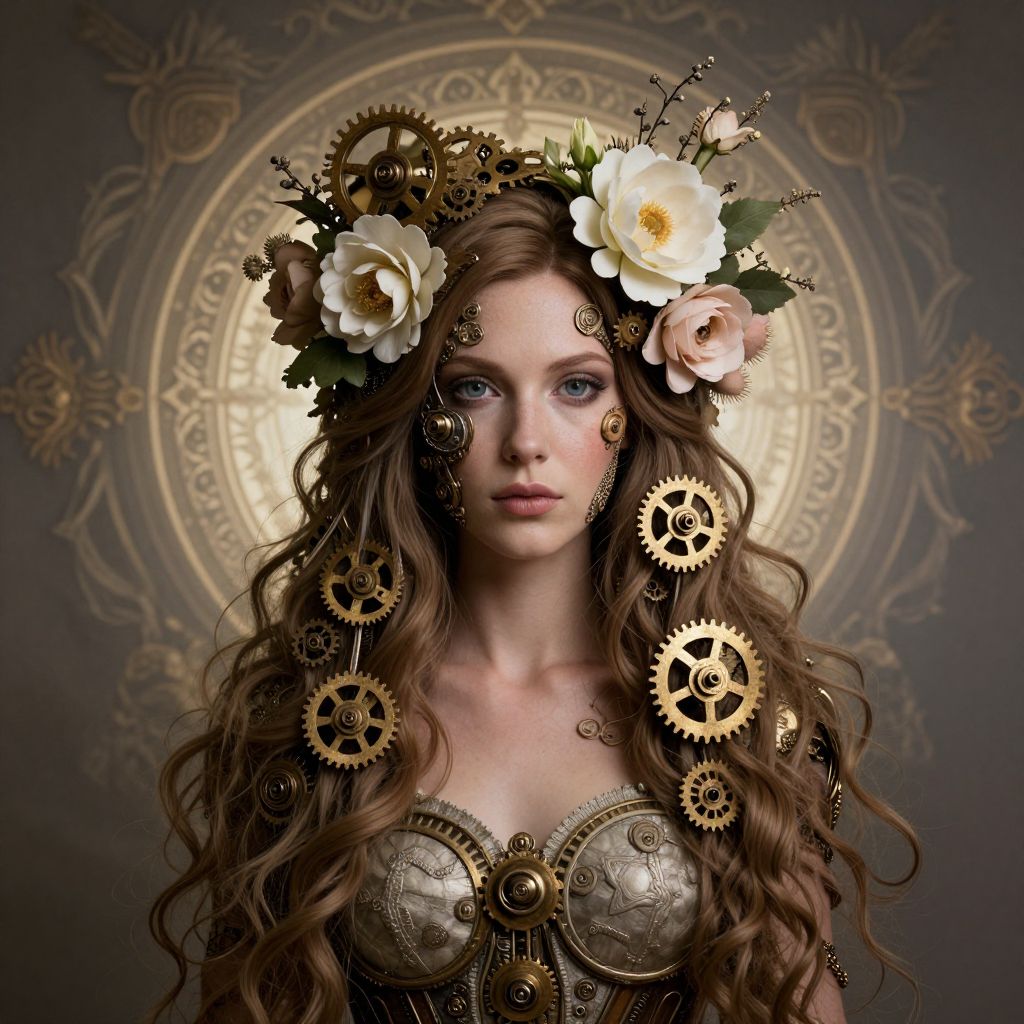 An ethereal steampunk woman with ornate mechanical details and floral adornments, set against a double exposure background with a circular pattern, evoking a sense of unease.