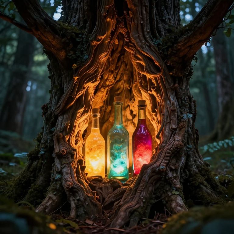 A mystical tree glows warmly from within, its hollowed trunk revealing three luminous bottles—each a vibrant hue—nestled like hidden treasures amidst a forest of enchantment and wonder.