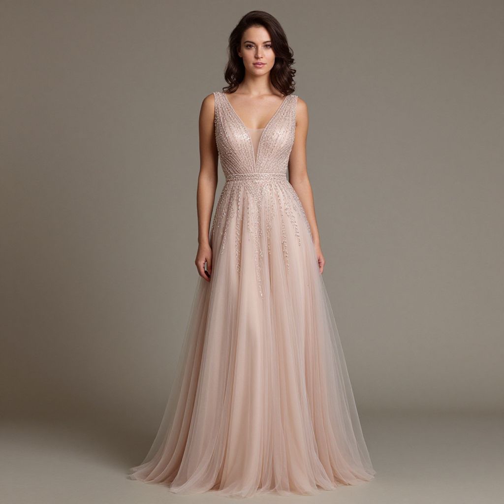 "Woman, formal elegance, sleeveless A-line gown in blush pink, V-neckline, shimmering beadwork on bodice, sheer overlay, natural waistline accentuated with additional beading, flowing tulle skirt, full-length, soft waves hairstyle, neutral studio background.. Sexy. Pretty face and beаutiful eyes. Big breasts."