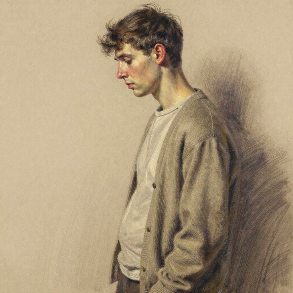 Digital portrait of a pensive young man with messy brown hair, wearing a beige cardigan over a white shirt, against a textured beige background.