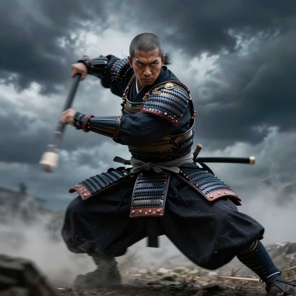 Photograph of a fierce samurai warrior in traditional armor, holding a katana, poised for battle against a dramatic, cloudy sky.
