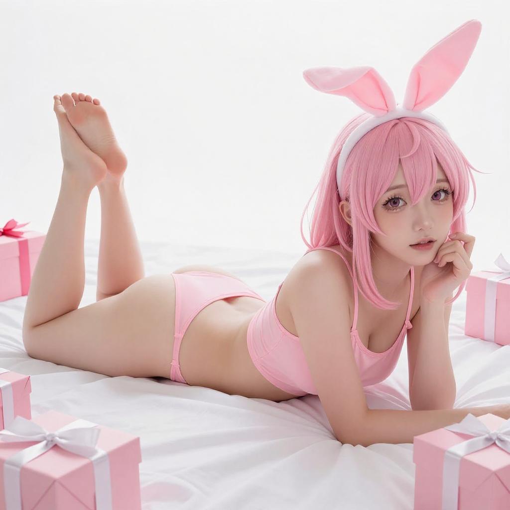 Digital artwork of a young woman with purple hair and white bunny ears, wearing a white hoodie, lying on her back with legs spread and feet in the foreground. She gazes at the viewer with a slightly open mouth. Bright white curtains form the background. Her hands rest on her feet, and her skin is pale.
