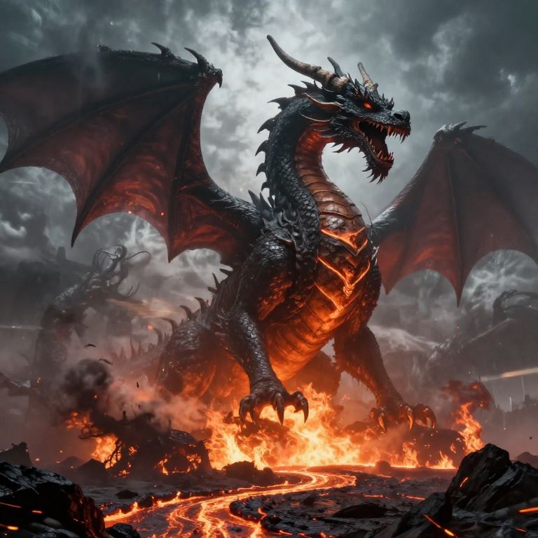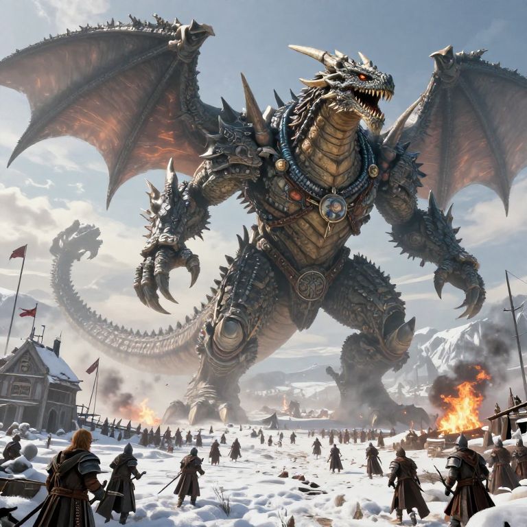 Upcycling Impossibly titanic kaiju dragon god of war, looming over an active snowy countryside battlefield, medieval,