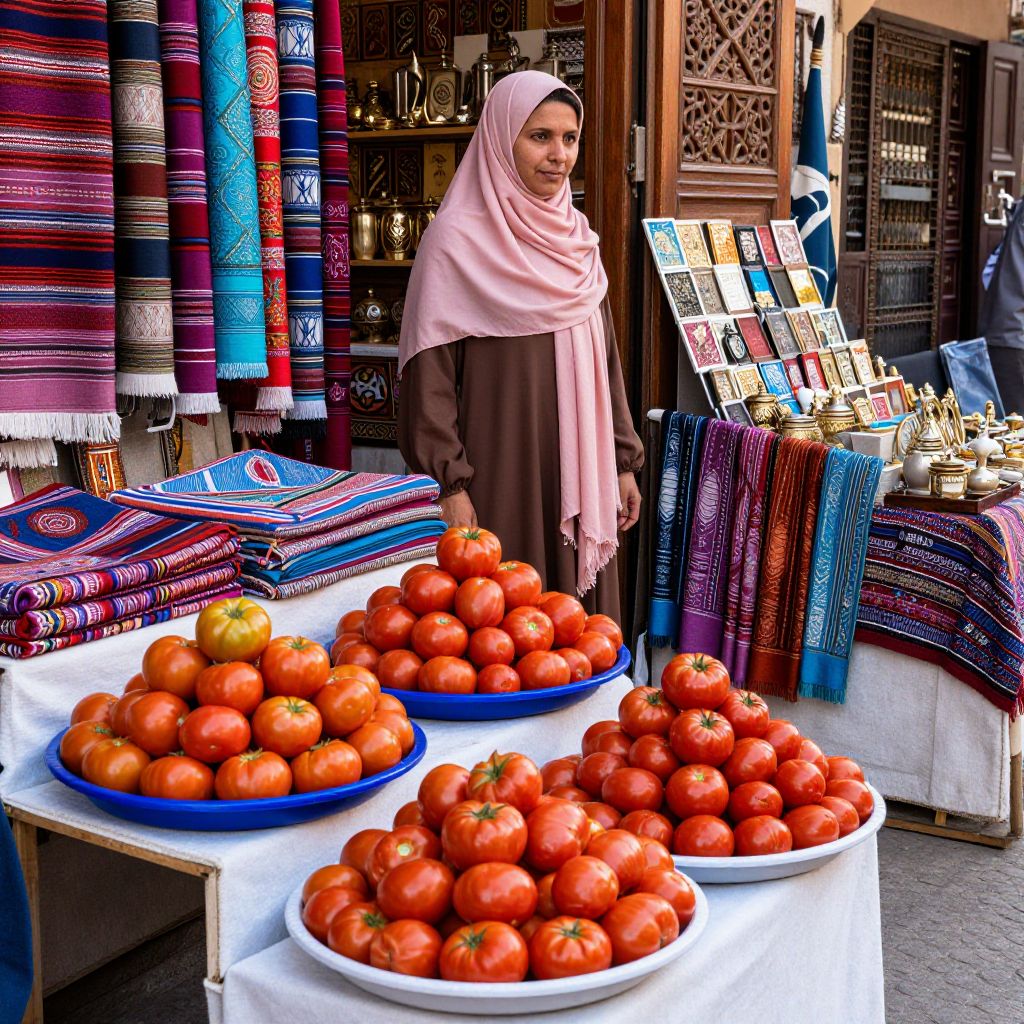 Vibrant tomatoes spill over trays as a woman in a pink hijab stands behind her stall, surrounded by colorful textiles and trinkets in the bustling souks of Marrakech, Morocco.